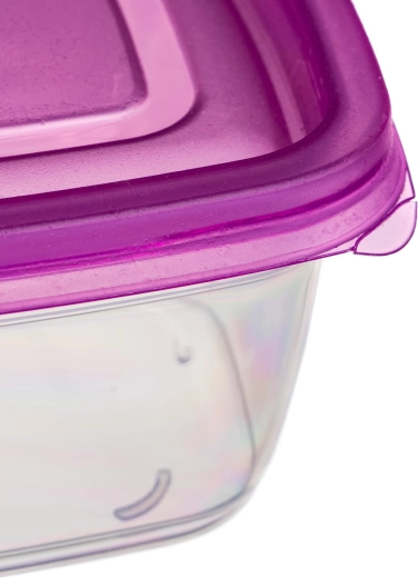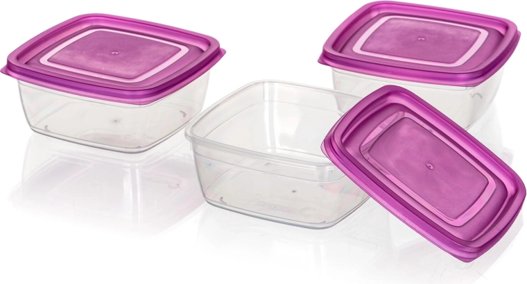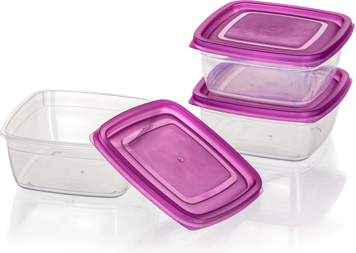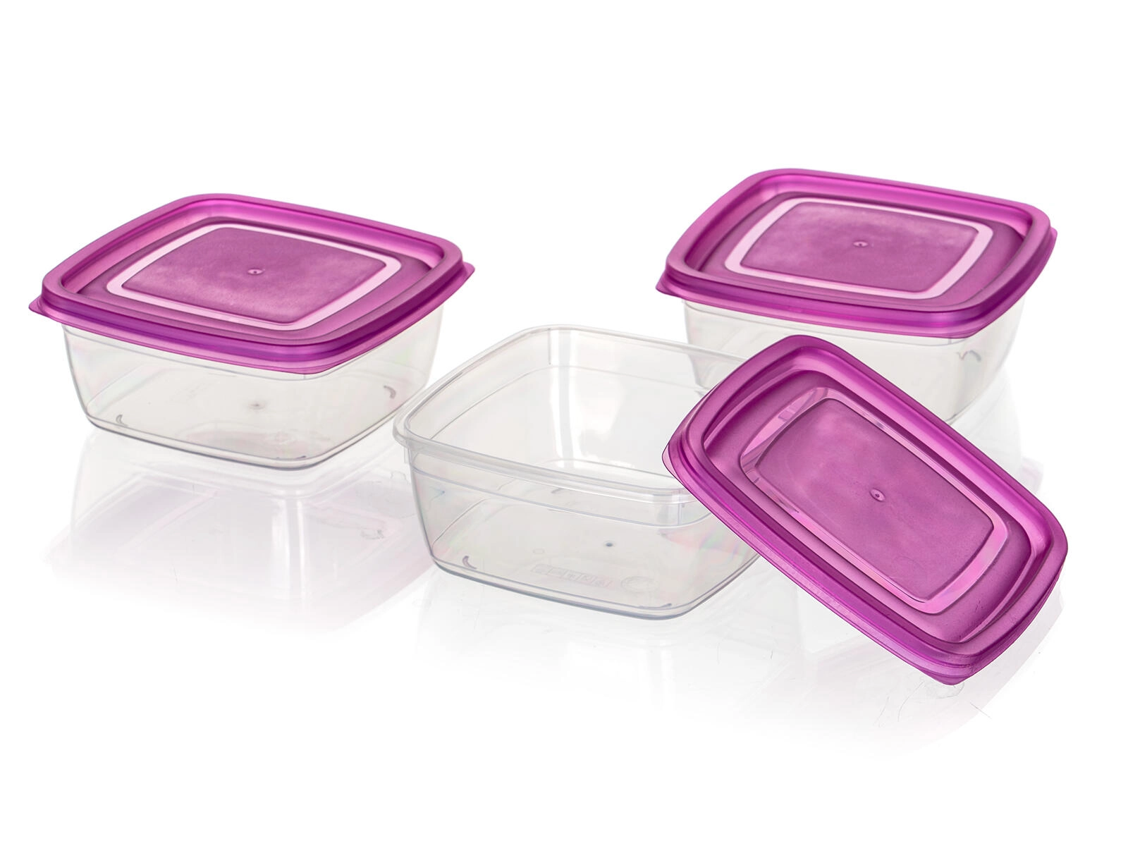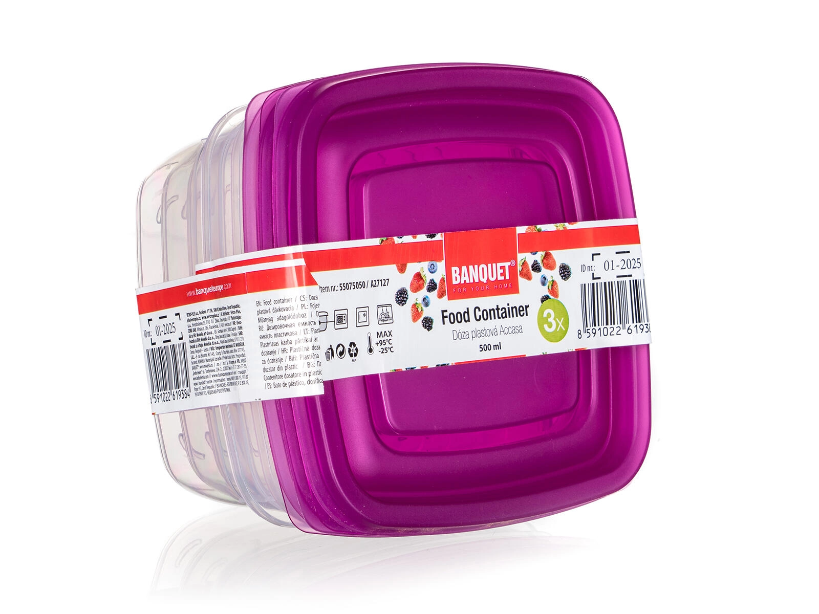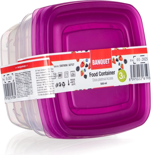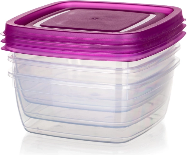 A 3 darabos, 0,5 l űrtartalmú ACCASA négyzet alakú doboz praktikus választás a mindennapi ételek, uzsonnák és alapanyagok tárolásához. Az átlátszó test gyors rálátást biztosít a tartalomra, a masszív, pattintós lila fedelek pedig segítenek megőrizni az frissességet és csökkentik a kiömlést. A stócolható kialakítás helyet takarít meg a hűtőben és a kamrában, a strapabíró műanyag pedig könnyű tisztítást és többszöri használatot tesz lehetővé.