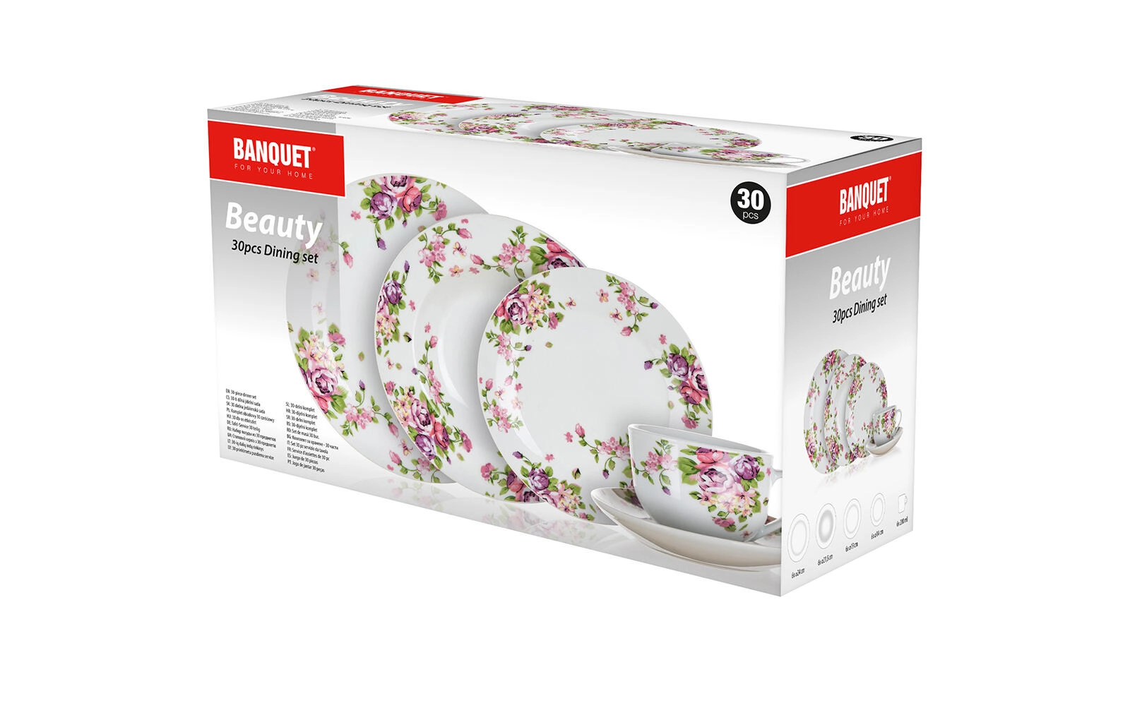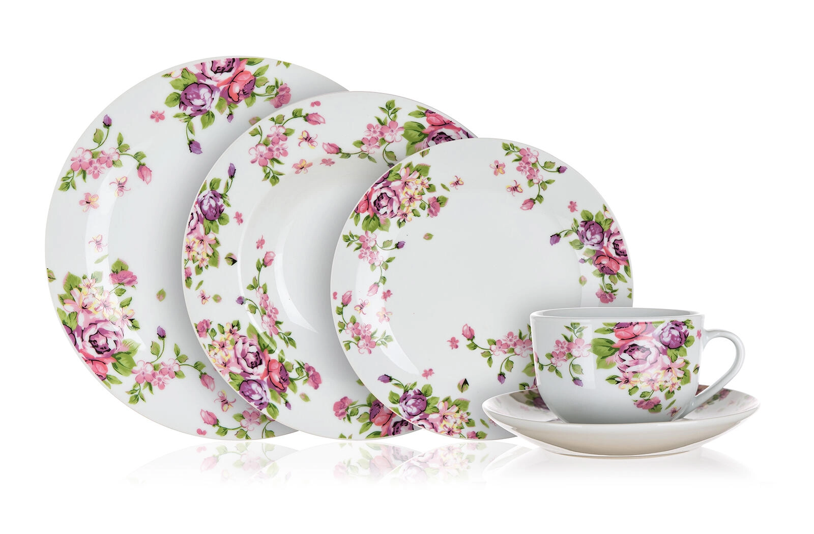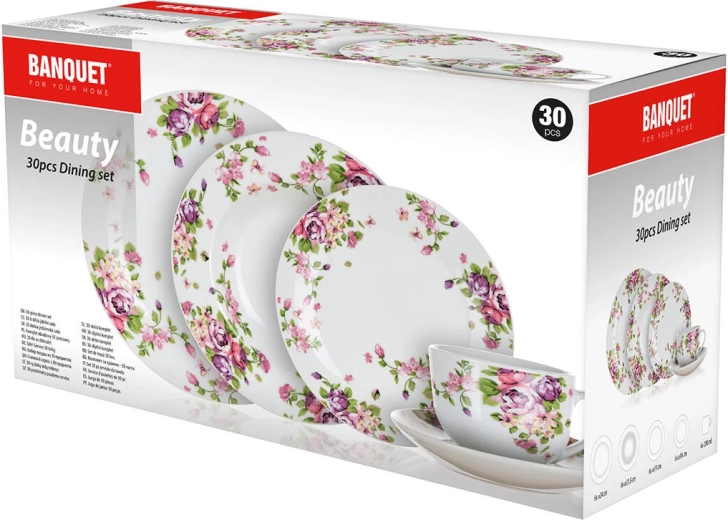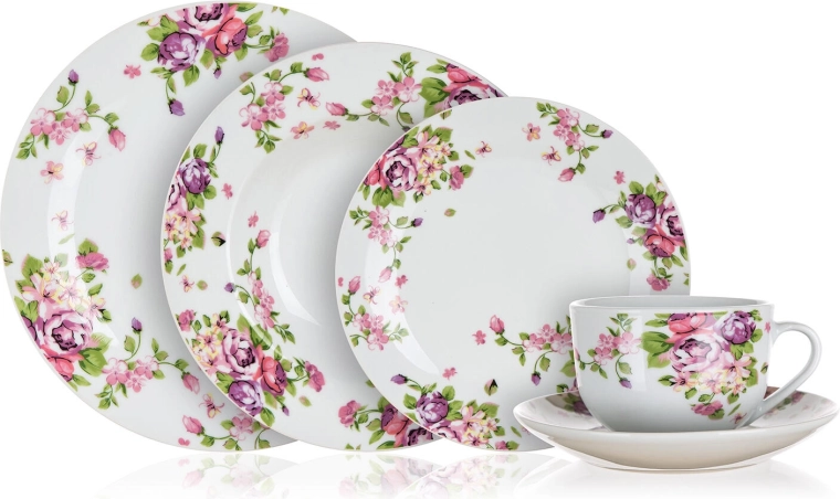 A stílusos Beauty étkészlet a klasszikus fehér porcelánt romantikus virágmintával ötvözi, amely minden darabon harmonizál. Átgondolt összeállításának köszönhetően mélytányérokat, lapostányérokat és desszerttányérokat kap, kiegészítve csészékkel és csészealjakkal kávé vagy tea tálalásához.