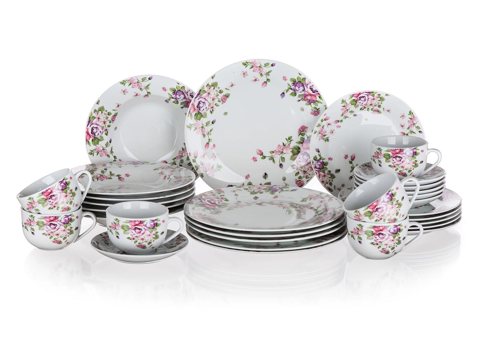 A készlet 30 részből áll: 6 mélytányér, 6 lapostányér és 6 desszerttányér, 6 csészealj és 6 csésze 220 ml űrtartalommal – ideális a mindennapi és ünnepi terítékhez is.