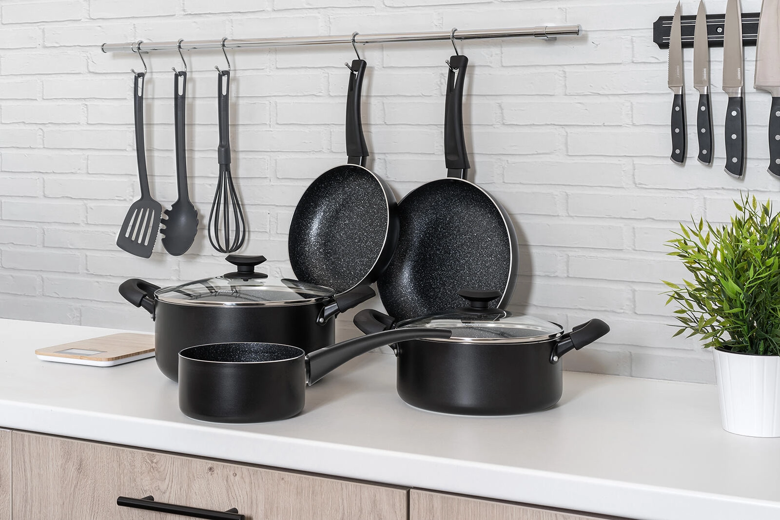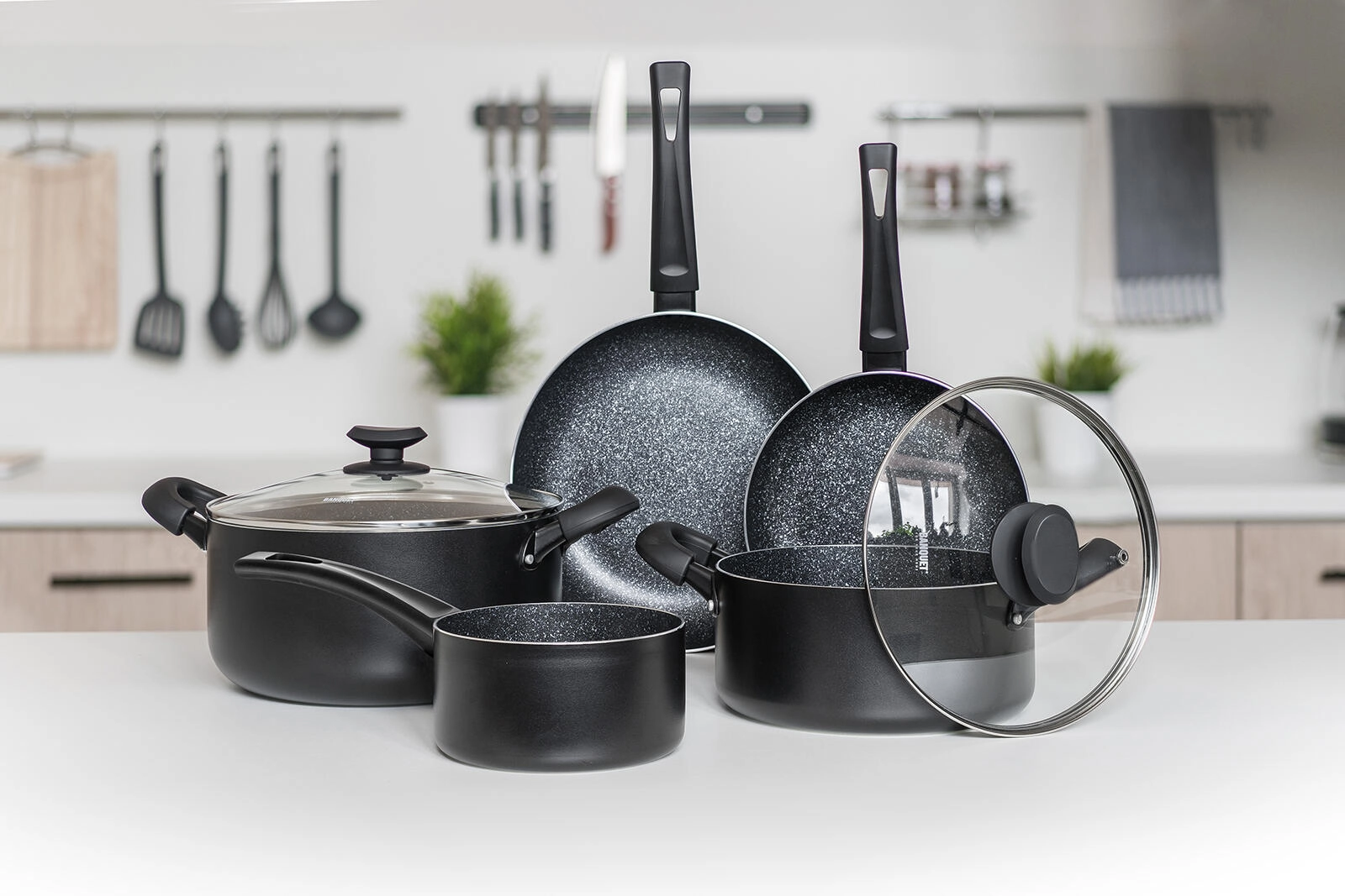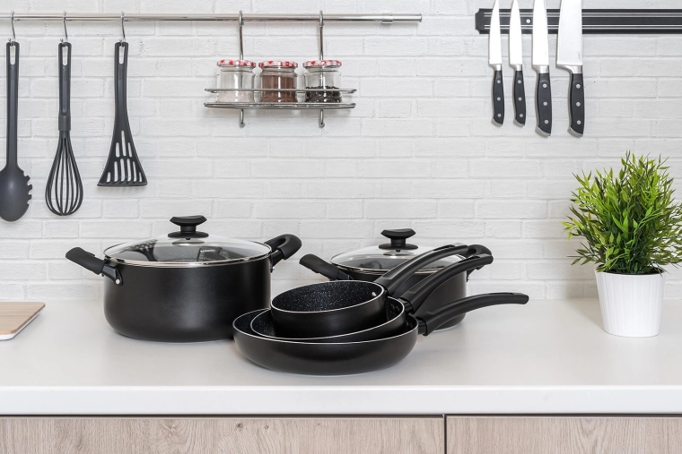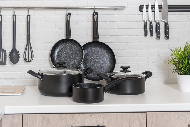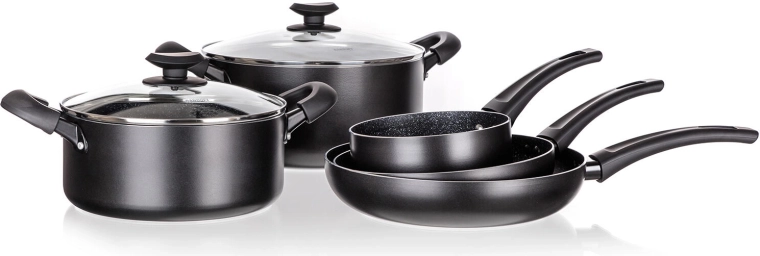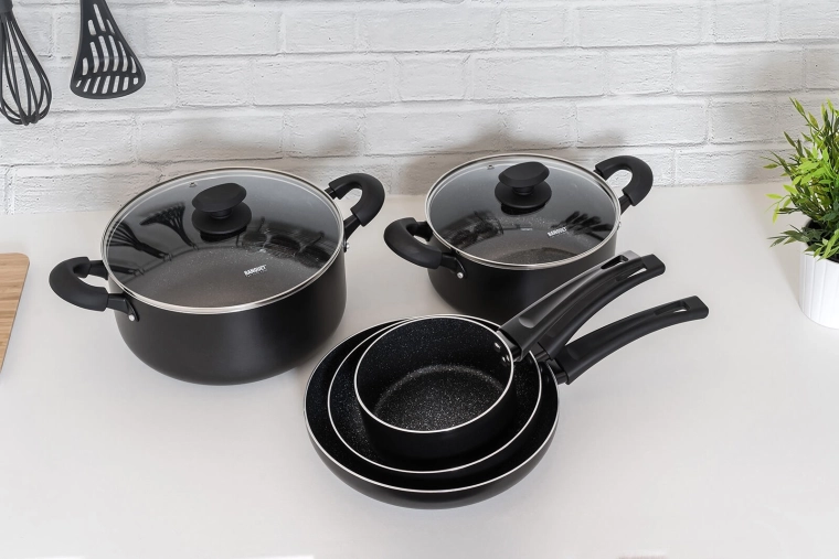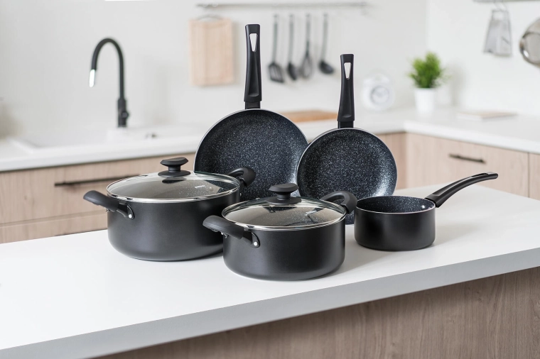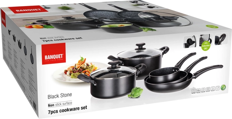 A BLACK STONE edénykészlet elegáns fekete kivitelben a mindennapi főzés teljes skáláját lefedi a gyors pirítástól a lassú párolásig. A kiváló hővezetésű öntött alumínium gyorsan felmelegszik és sokáig tartja a hőt, így gyorsabban és takarékosabban főzhet. A rendkívül tartós tapadásmentes felület könnyű ételkioldást és egyszerű tisztítást biztosít.