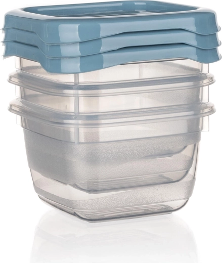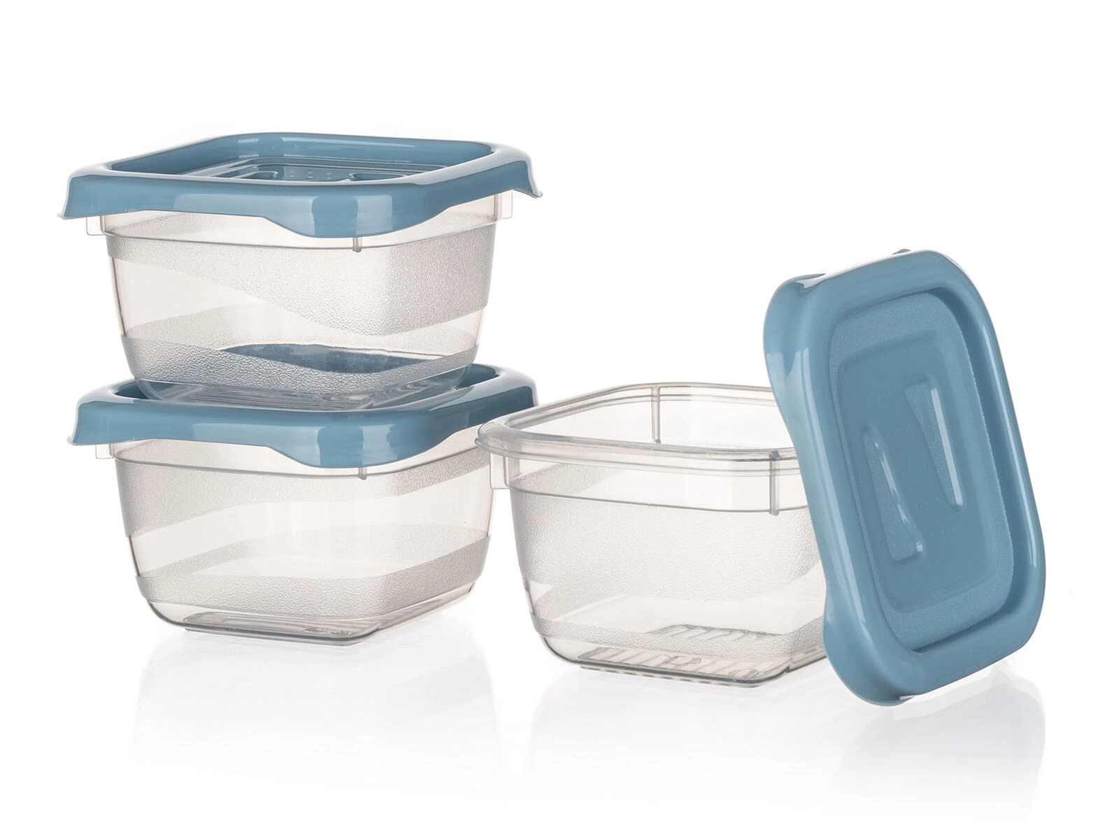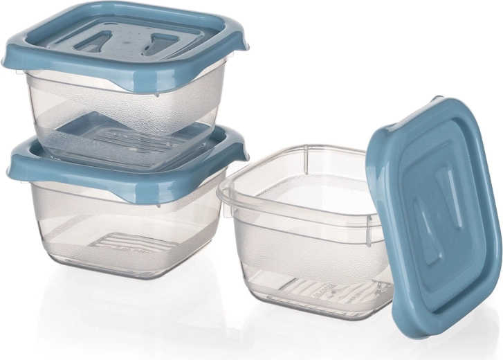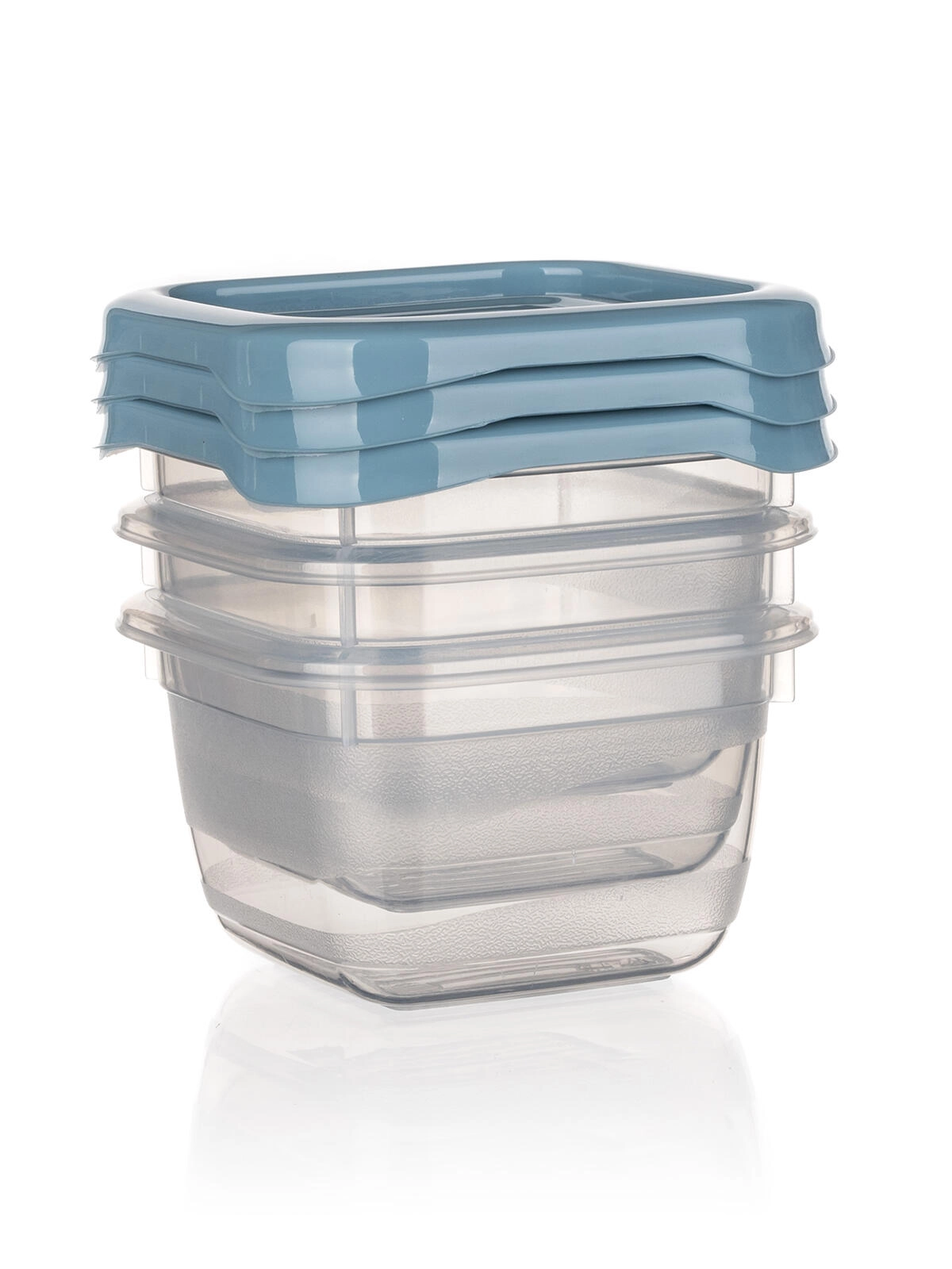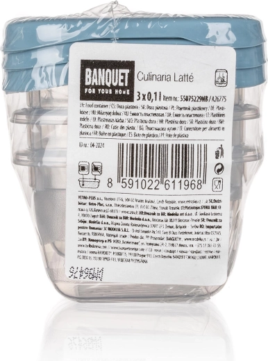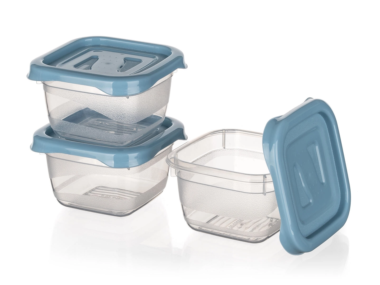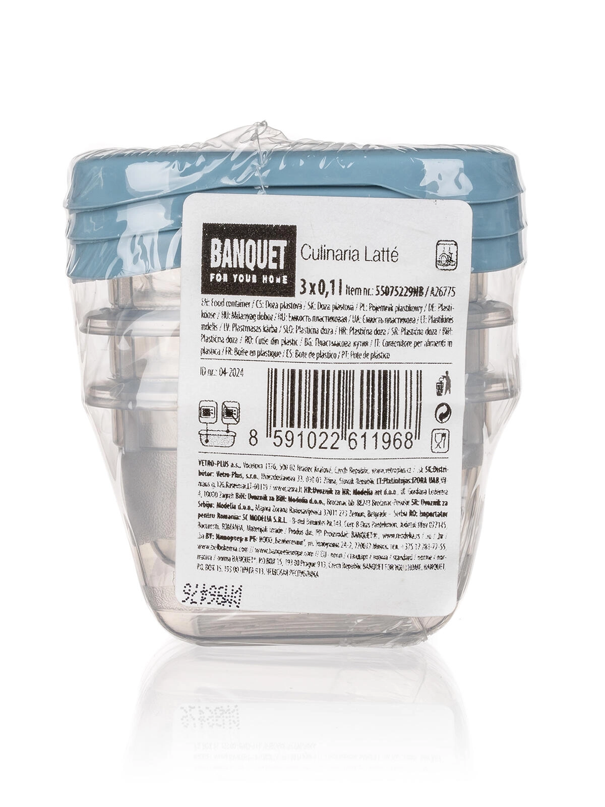 A három darabos, 0,1 l űrtartalmú CULINARIA négyszögletes doboz kompakt készlete ideális kis adagok, öntetek és snackek tárolására. A nordic blue árnyalatú praktikus fedelek szorosan illeszkednek, az edények mosogatógépbe, mikrohullámú sütőbe és fagyasztóba is alkalmasak, és a átlátszó műanyagnak köszönhetően mindig látható a tartalom.