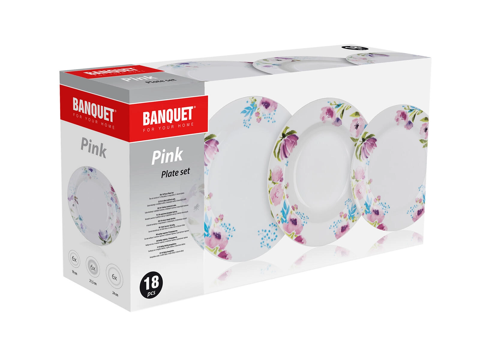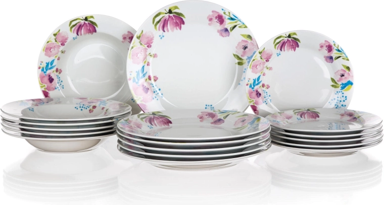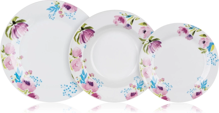 A szett 18 darabból áll: 6× desszertes tányér 19 cm, 6× mélytányér 21,5 cm és 6× lapostányér 24 cm. Minden, ami a mindennapi és ünnepi étkezésekhez szükséges.