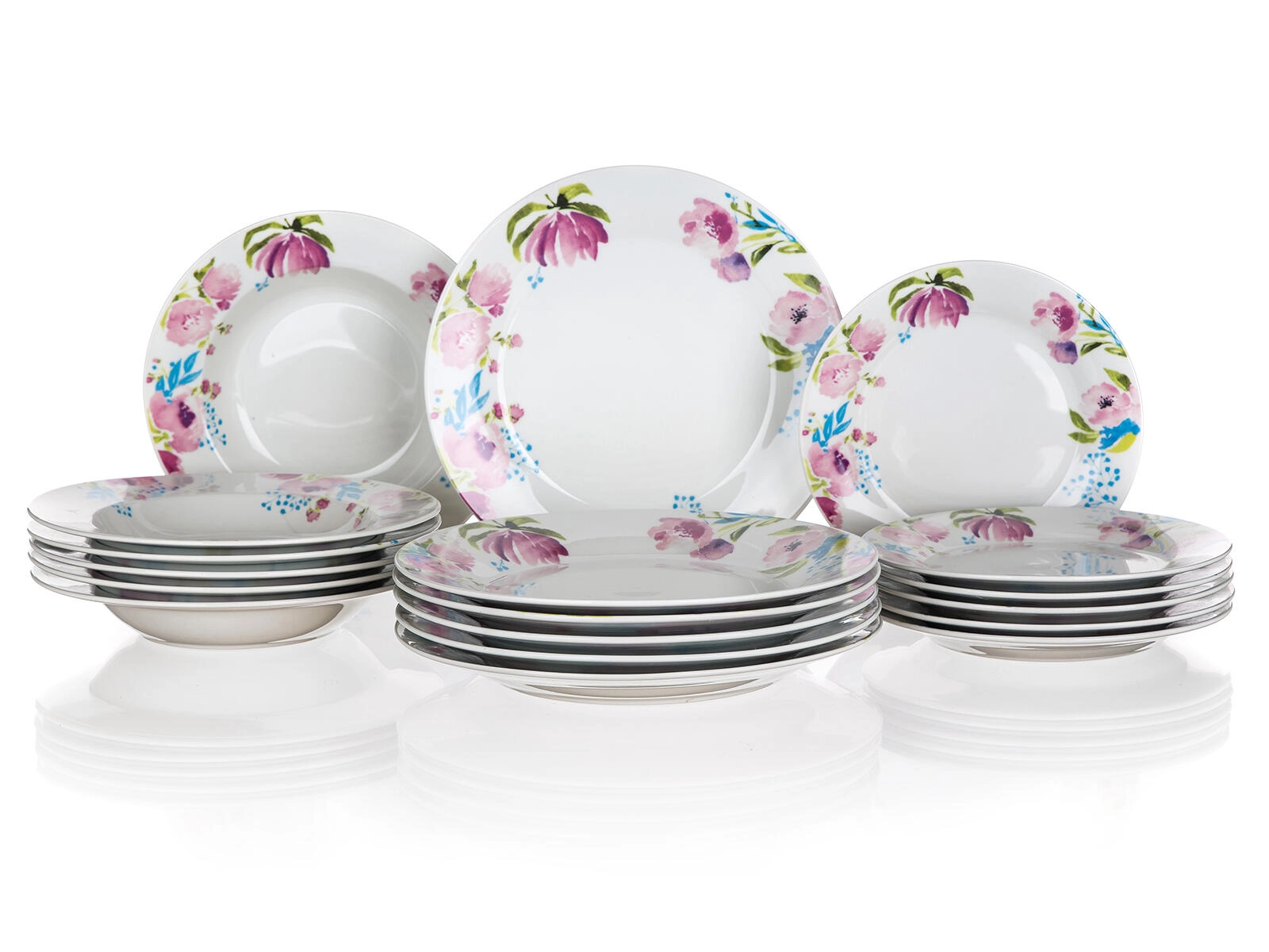 6× desszertes tányér 19 cm; 6× mélytányér 21,5 cm; 6× lapostányér 24 cm