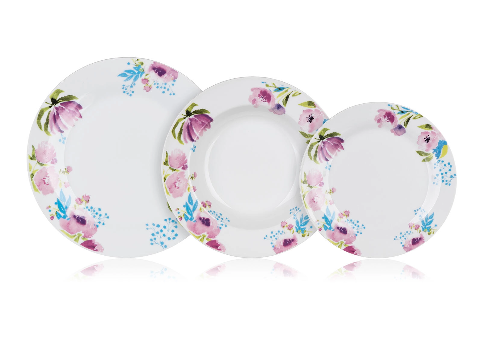 Finom rózsaszín, lila és kék virágok a peremen friss megjelenést kölcsönöznek a fehér porcelánnak, és könnyen kombinálhatók más edényekkel és textíliákkal.