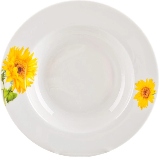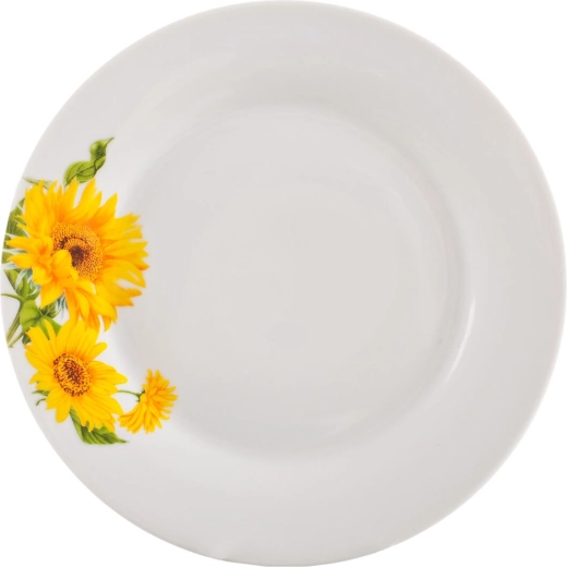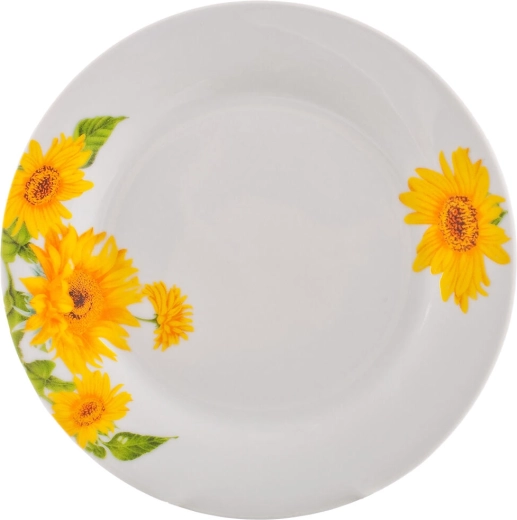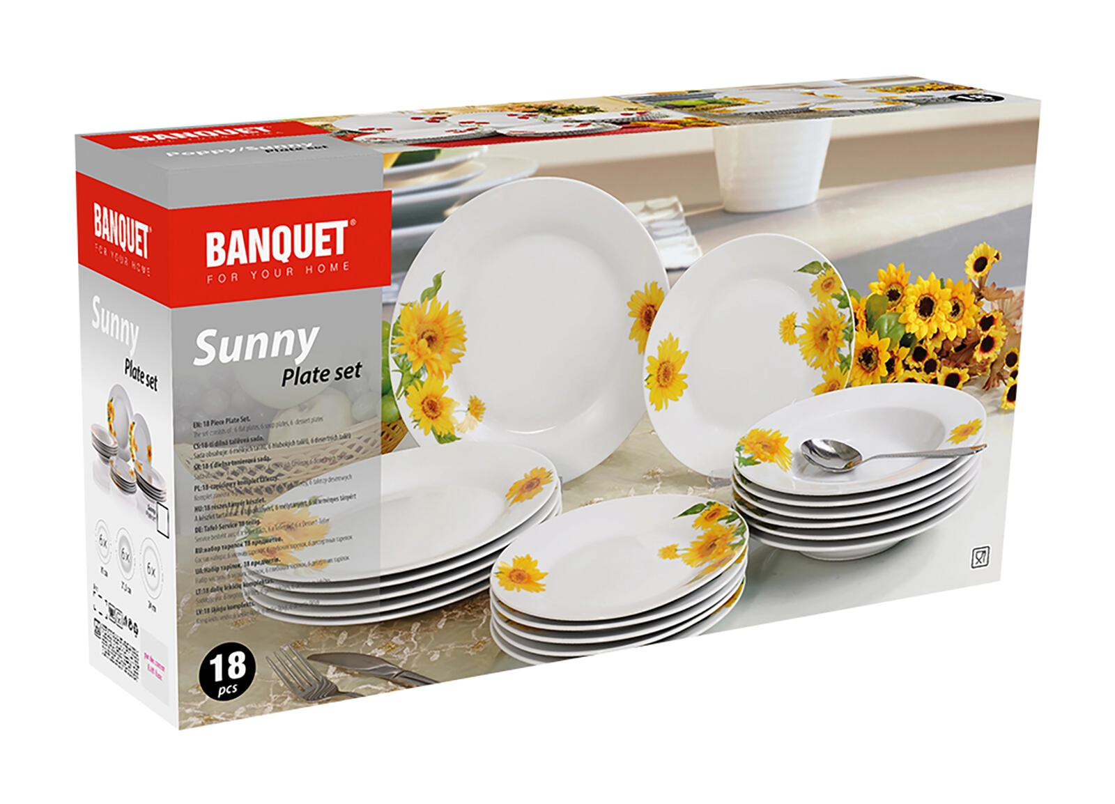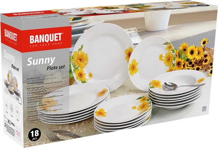 Dobja fel minden terítékét a SUNNY napraforgómintás porcelán készlettel. Az elegáns fehér porcelán fényes felülettel és karakteres virágos dekorral ideális a mindennapi étkezésekhez és az ünnepi alkalmakhoz is. A készlet 18 részből áll 6 személy részére, és alkalmas mosogatógéphez és mikrohullámú sütőhöz is.