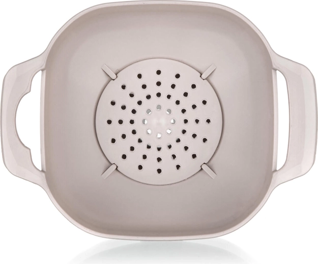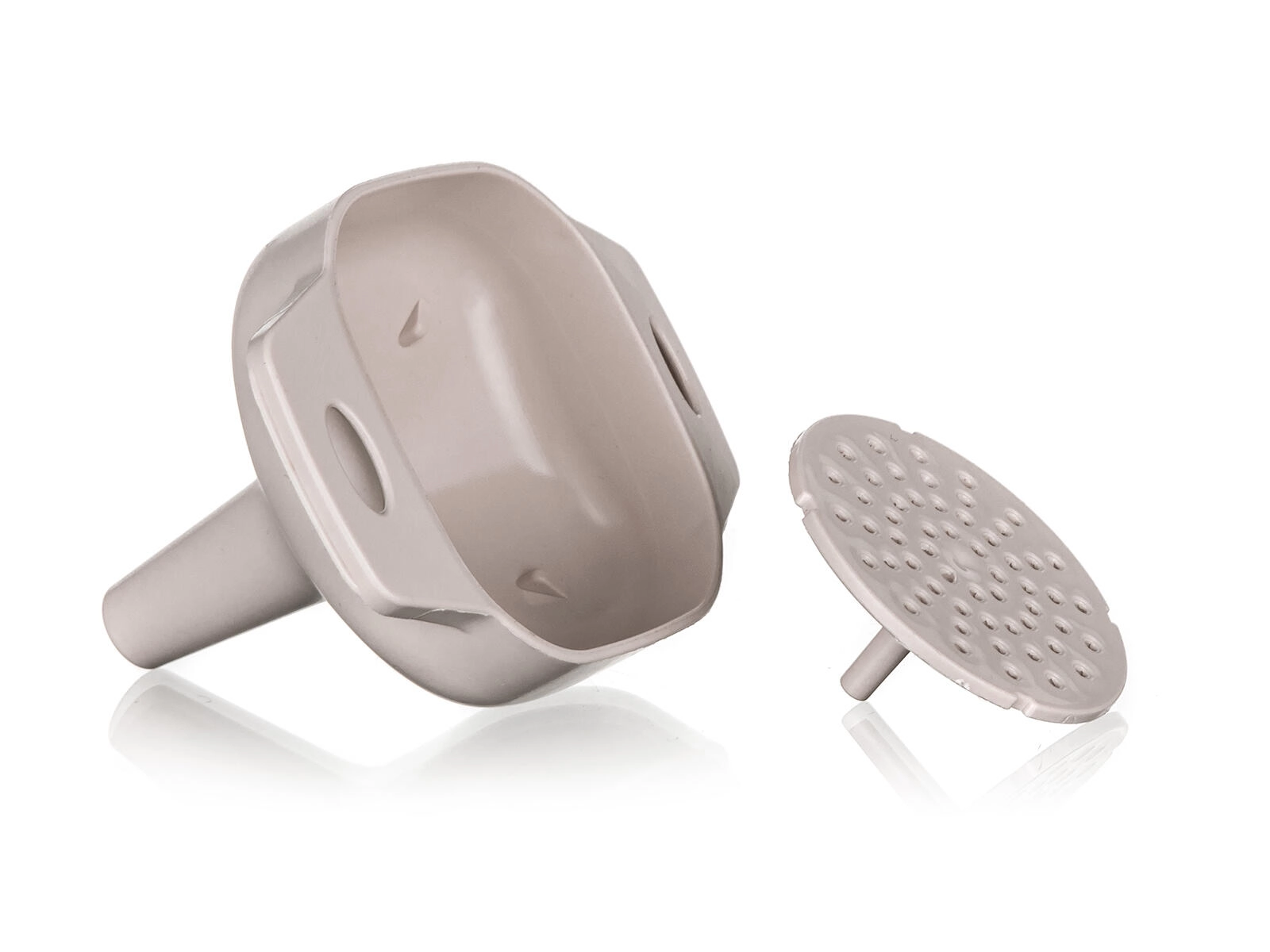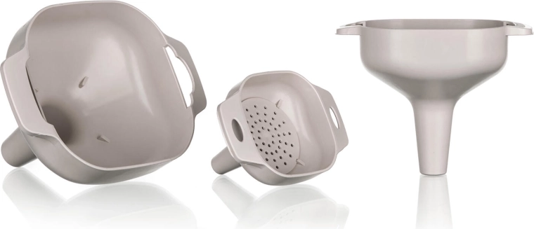 A könnyű és tartós műanyag könnyen tisztítható és kíméletes a felületekhez. Az ergonomikus formák praktikus fülekkel kényelmes fogást és pontos célzást biztosítanak az edény nyakába. A semleges latte szín remekül illik a modern és a klasszikus konyhákhoz is.
