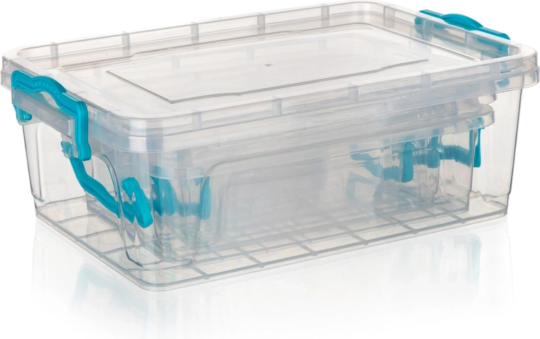 A türkiz klipszek megbízhatóan rögzítik a fedelet tárolás és hordozás közben is. A tartalom biztonságban marad.