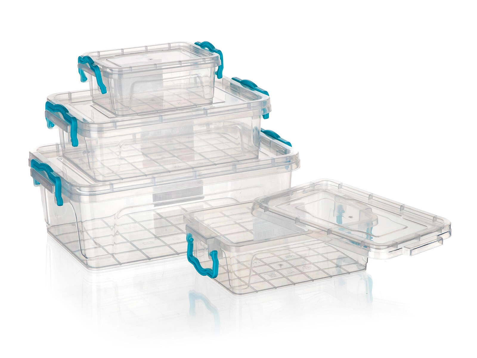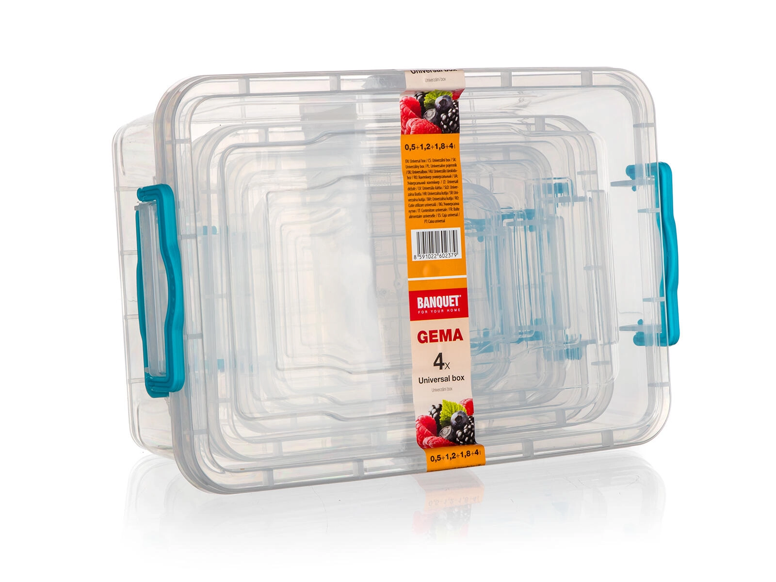 A GEMA készlet négy univerzális műanyag dobozt tartalmaz 0,5 l, 1,2 l, 1,8 l és 4 l űrtartalommal. A átlátszó oldalfalaknak köszönhetően mindig gyorsan látható a tartalom, míg a pattintható türkiz fogantyúk a fedelet tárolás és szállítás közben is szorosan zárva tartják.