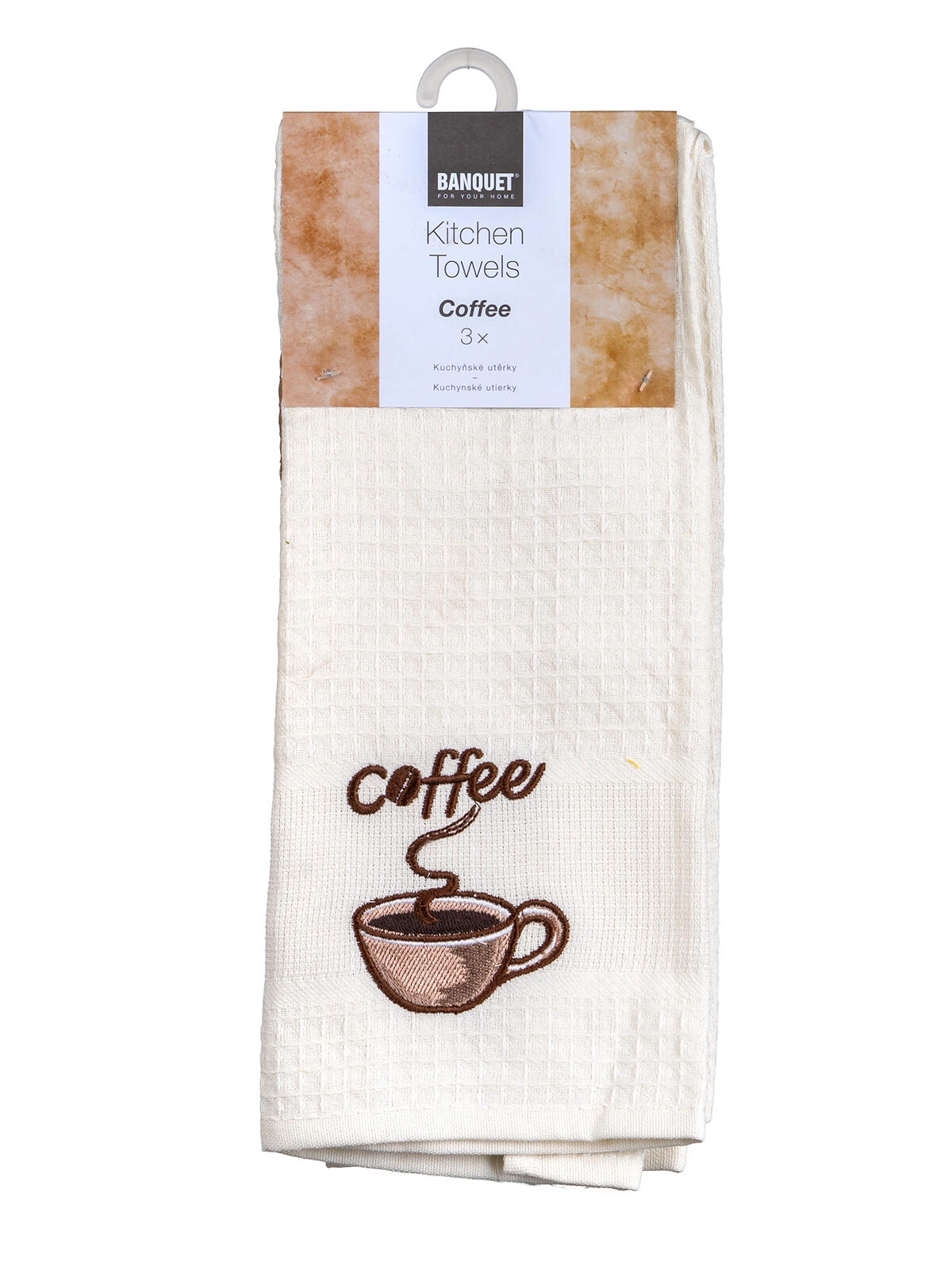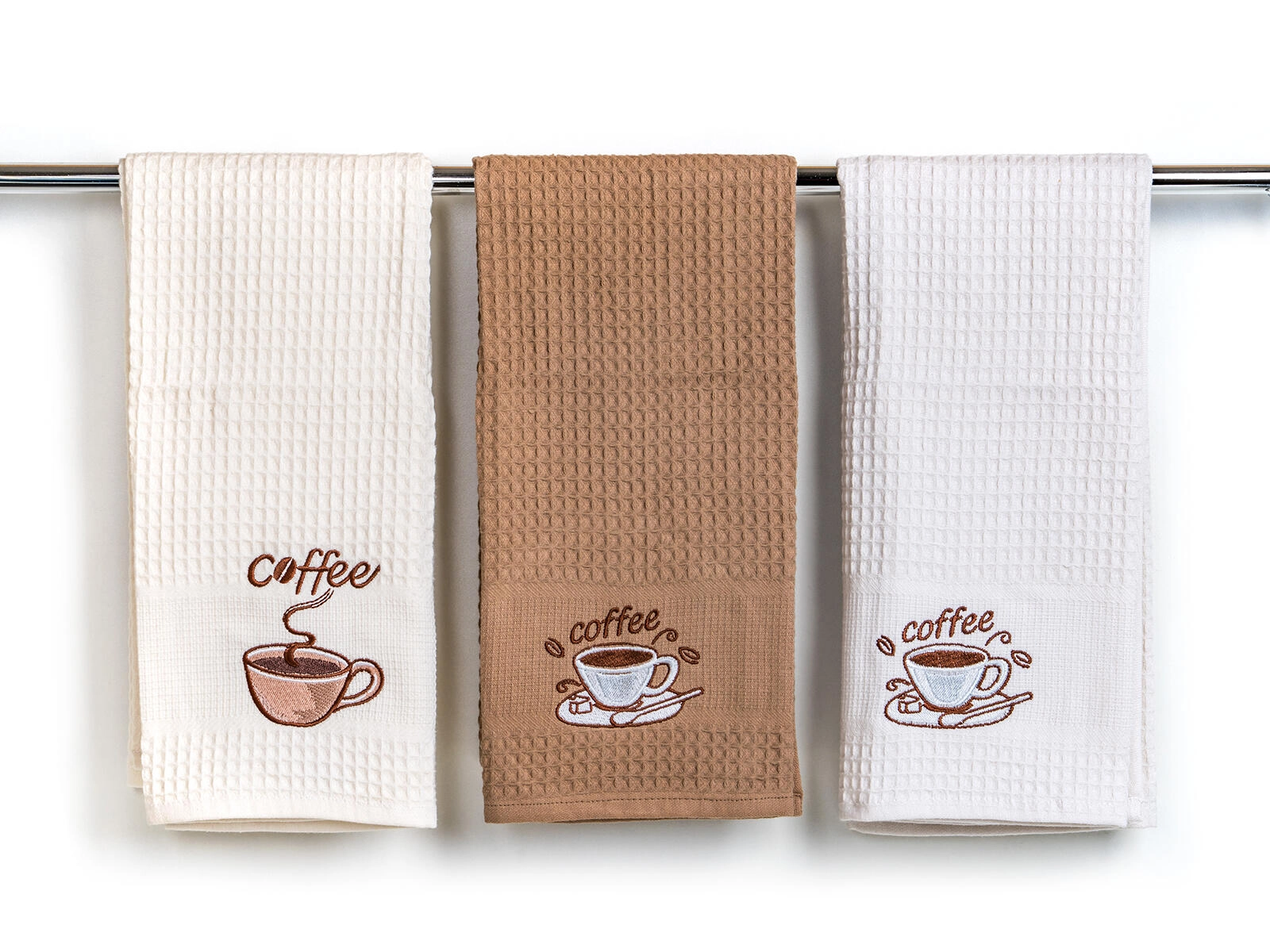 A dekoratív coffee hímzés stílust kölcsönöz a konyhának. A három darabos szett fehér, krém és bézs árnyalatban bármely enteriőrbe illik.