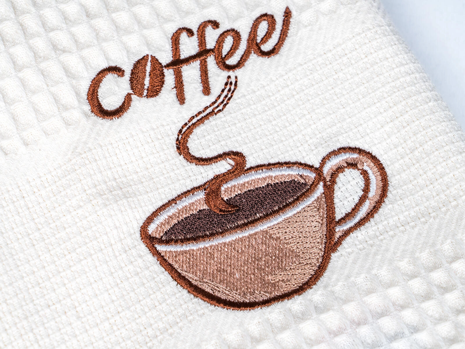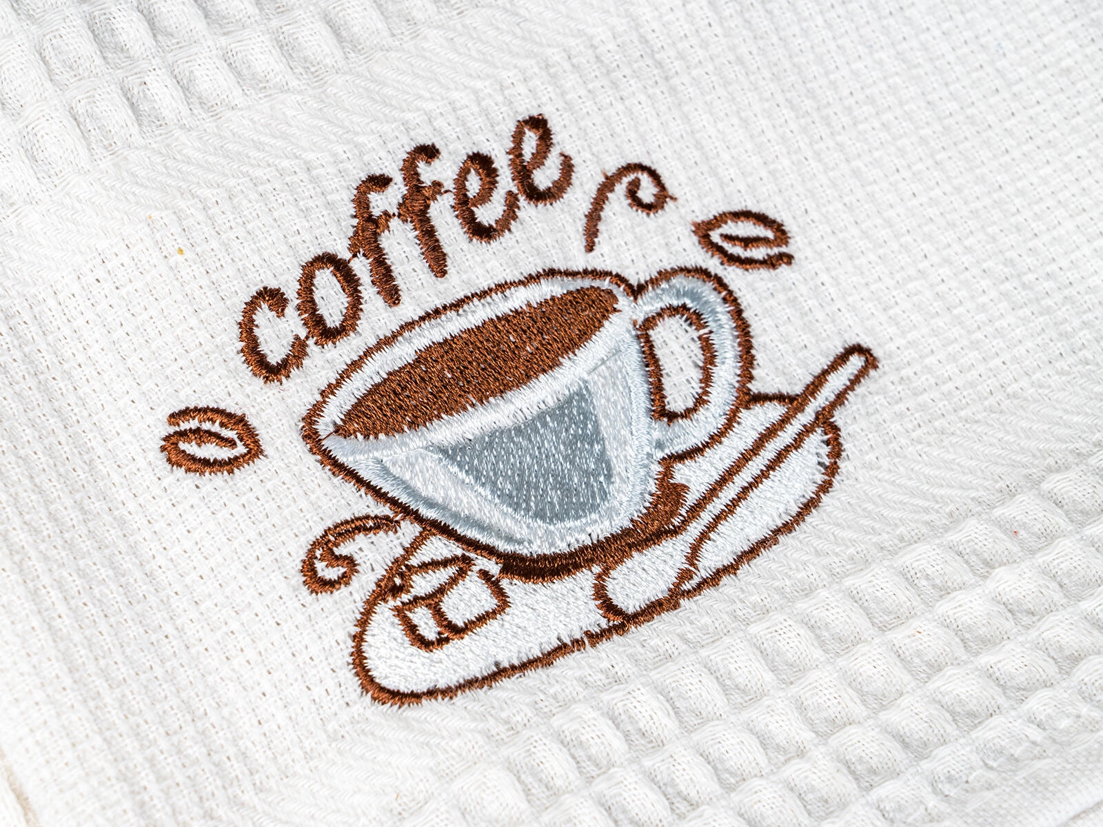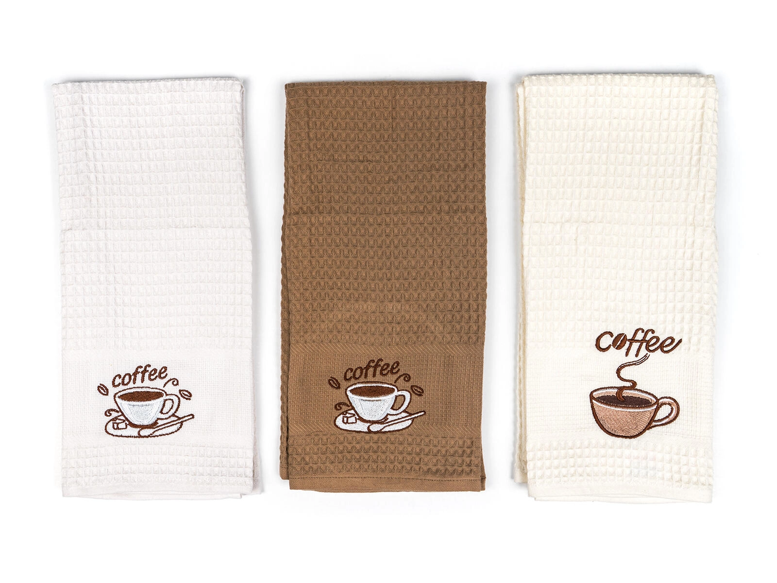Közkedvelt waffle törlők elegáns COFFEE hímzéssel, nélkülözhetetlen segítők edények és kezek törléséhez. A minőségi pamut anyagnak köszönhetően kiválóan szívják a nedvességet, gyorsan száradnak és tartósak. Időtlen színeik könnyen kombinálhatók más konyhai textilekkel.