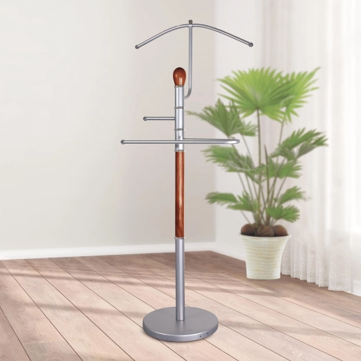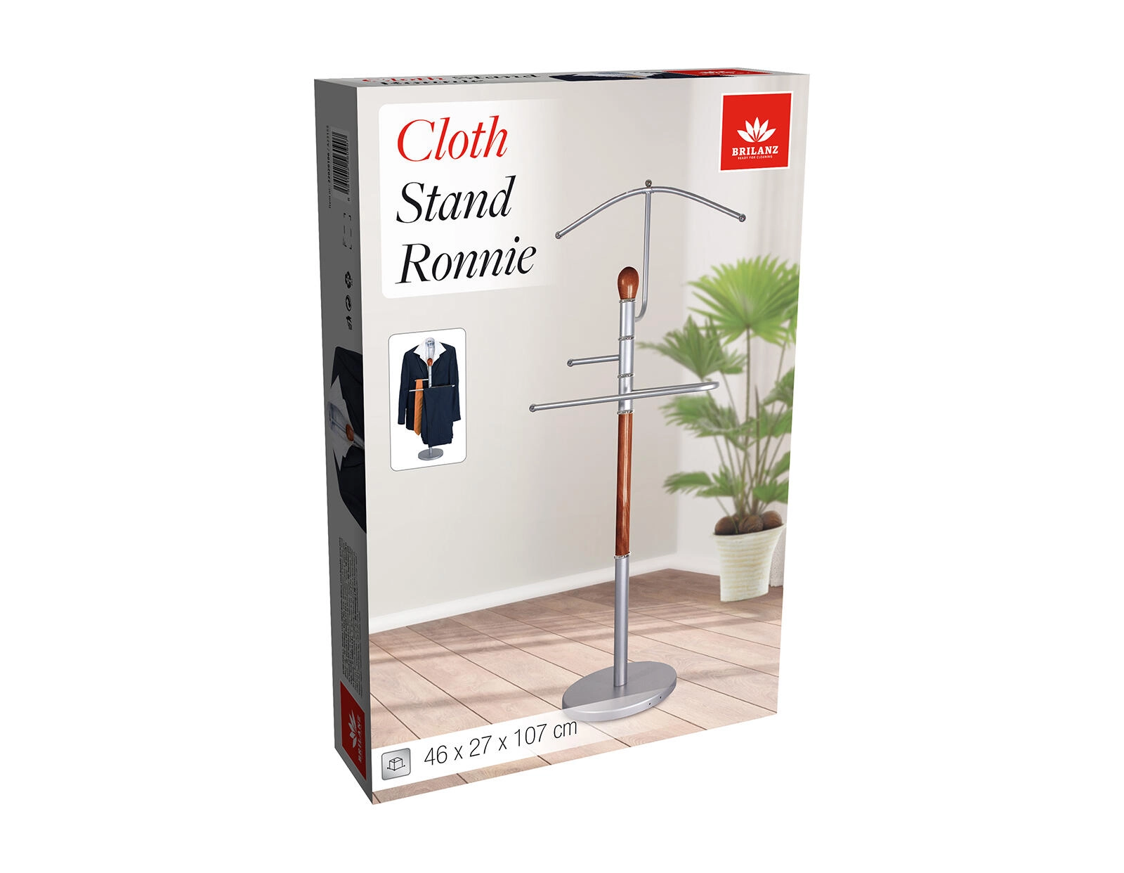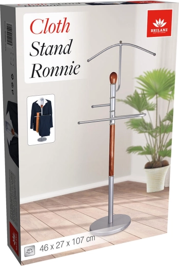 Az elegáns RONNIE néma inas a matt krómot és a középbarna árnyalatú természetes fát ötvözi a ruhák stílusos és praktikus elhelyezéséhez. A stabil talpnak és a 107 cm magasságnak köszönhetően az ingek, zakók és nadrágok mindig áttekinthetően kéznél lesznek.