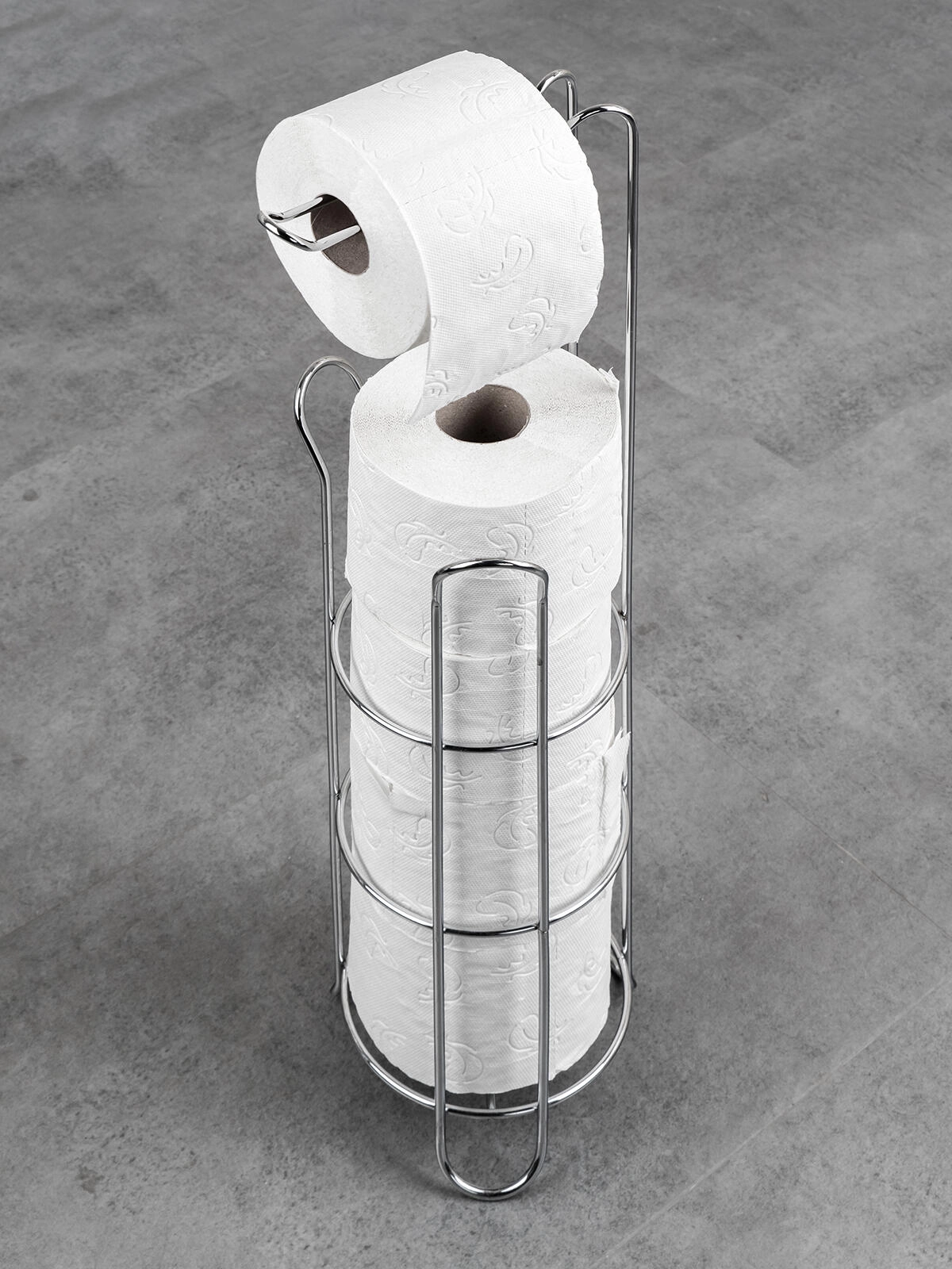Elegáns WC‑papírtartó állvány krómozott kivitelben, amely ötvözi a praktikus tárolást akár 4 gurigáig (3 az állványban + 1 a tartón) a helytakarékos kialakítással. A stabil fém szerkezet fényes felülettel modern megjelenést ad fürdőszobájának, és könnyű hozzáférést biztosít a gurigákhoz, amikor csak szüksége van rájuk.