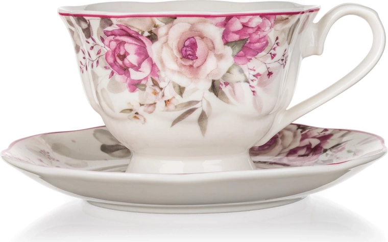 Elegáns ROSE csésze alátéttel, 220 ml űrtartalommal, minőségi kerámiából. Ideális a mindennapi és ünnepi kávé- és teakínáláshoz. Finom rózsás virágminta romantikus hangulatot kölcsönöz az asztalnak, miközben a praktikus tulajdonságok – mosogatógépben mosható és mikrohullámú sütőben használható – egyszerű használatot és karbantartást biztosítanak.