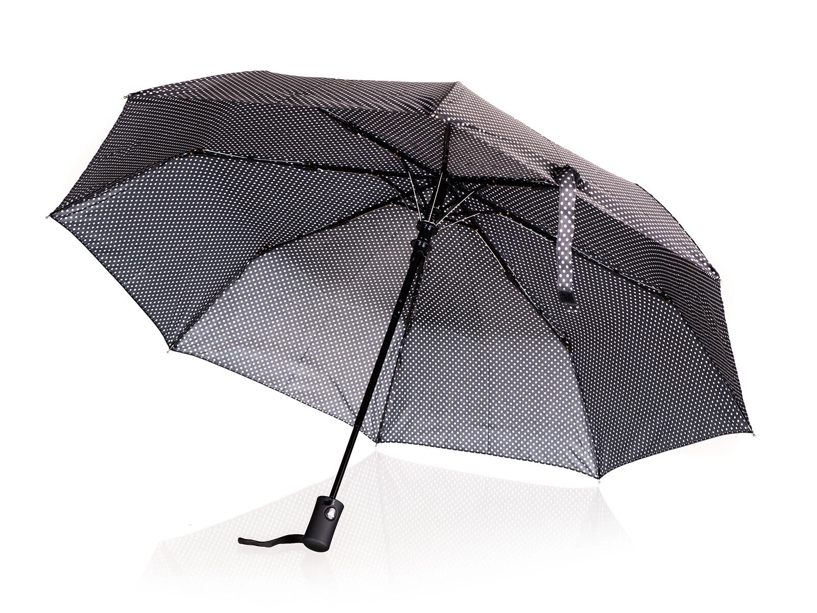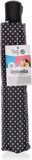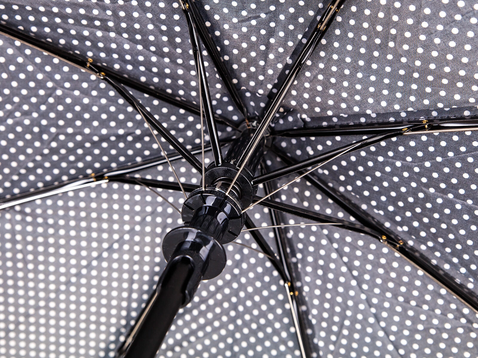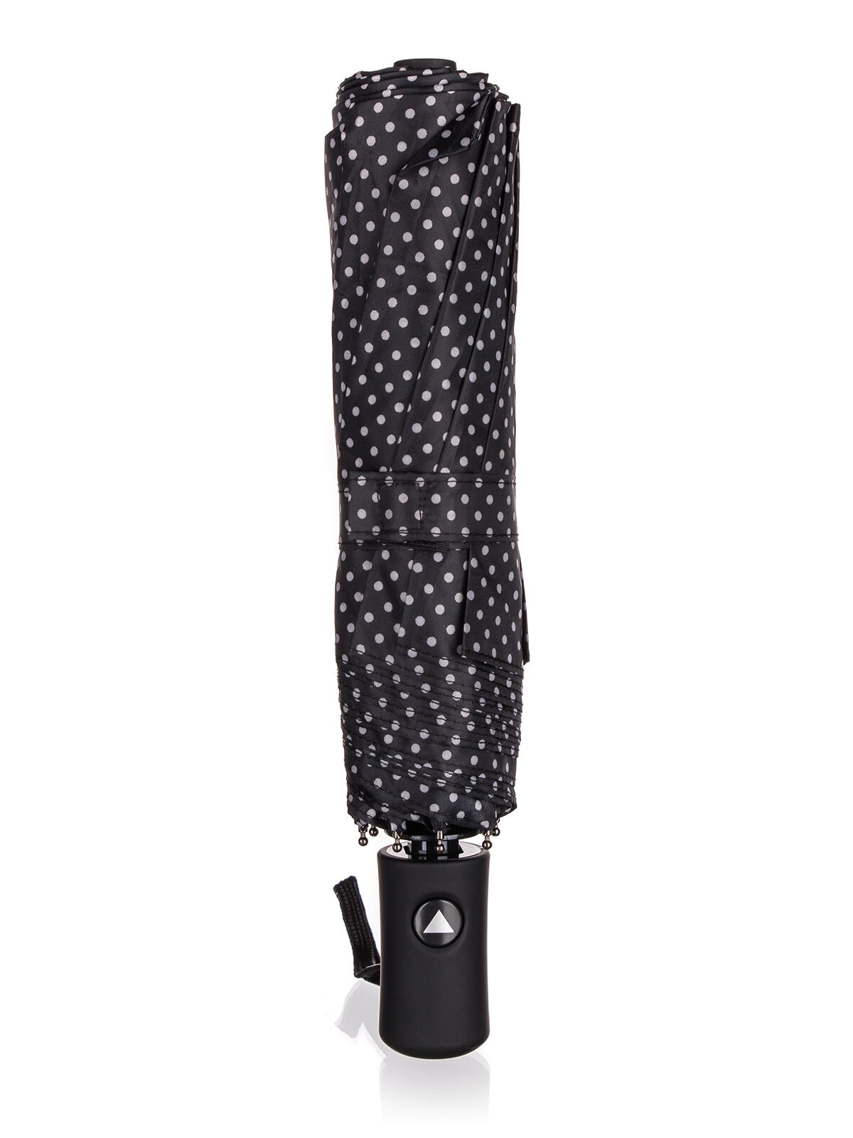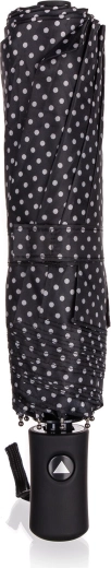 Elegáns, 52 cm átmérőjű, fekete színű fehér pöttyös, összecsukható esernyő megbízható védelmet nyújt eső és nap ellen. A automatikus nyitásnak, a szélálló szerkezetnek és a vízálló poliészternek köszönhetően ideális a kézitáskába vagy hátizsákba a mindennapokra.