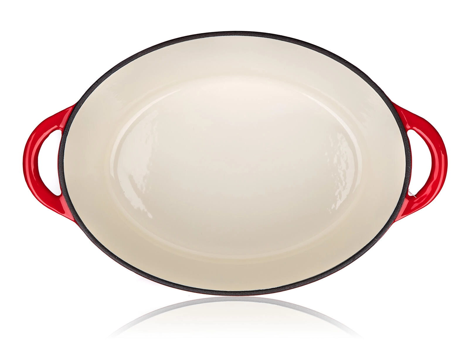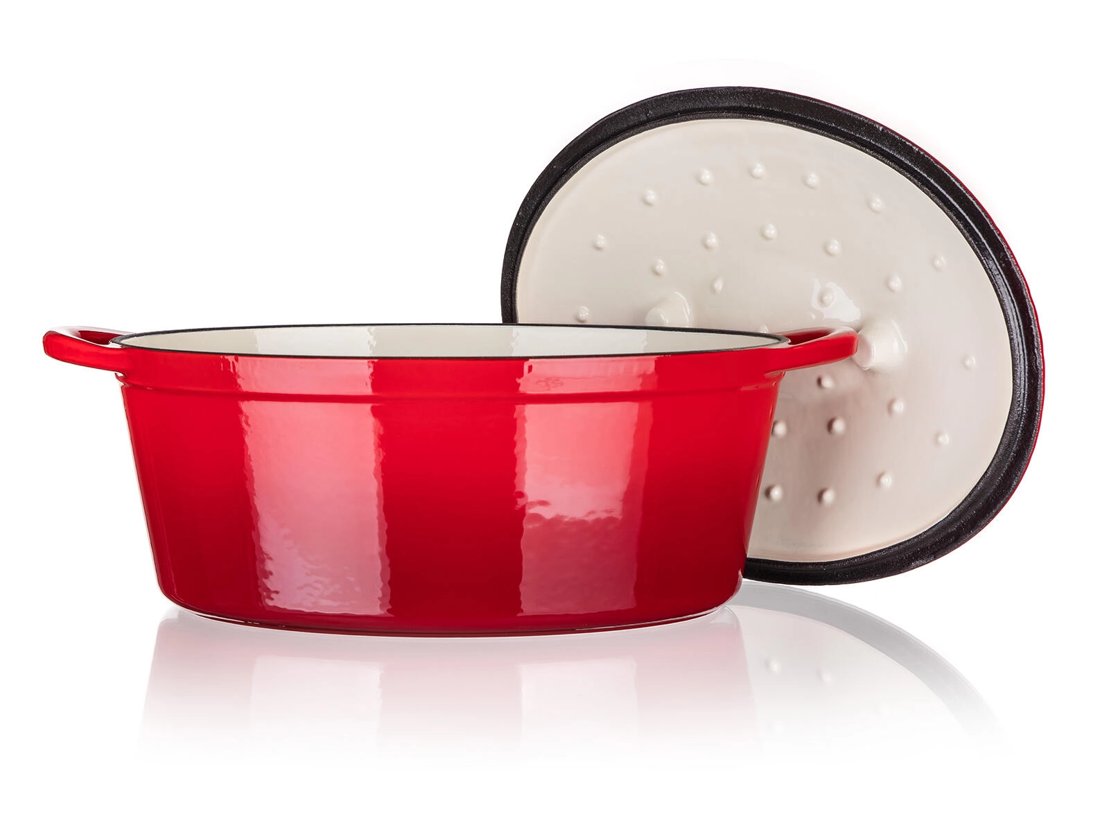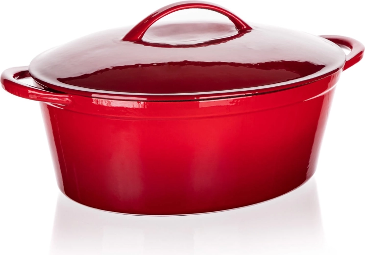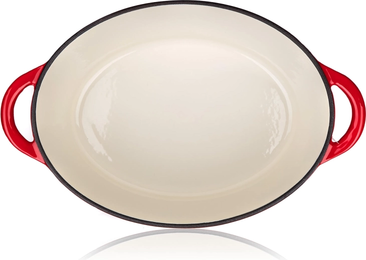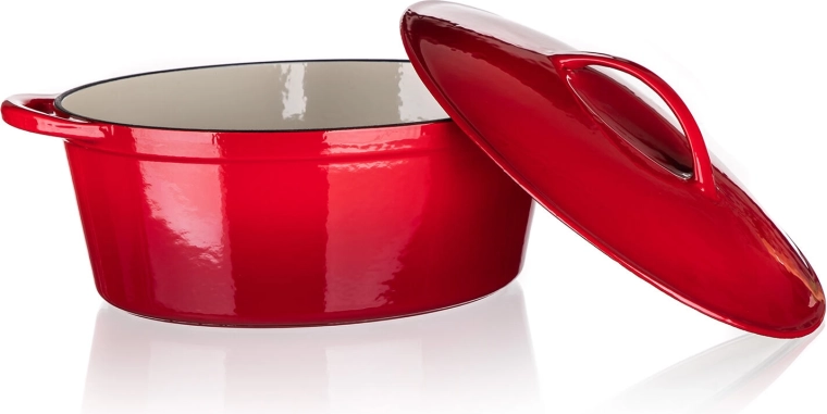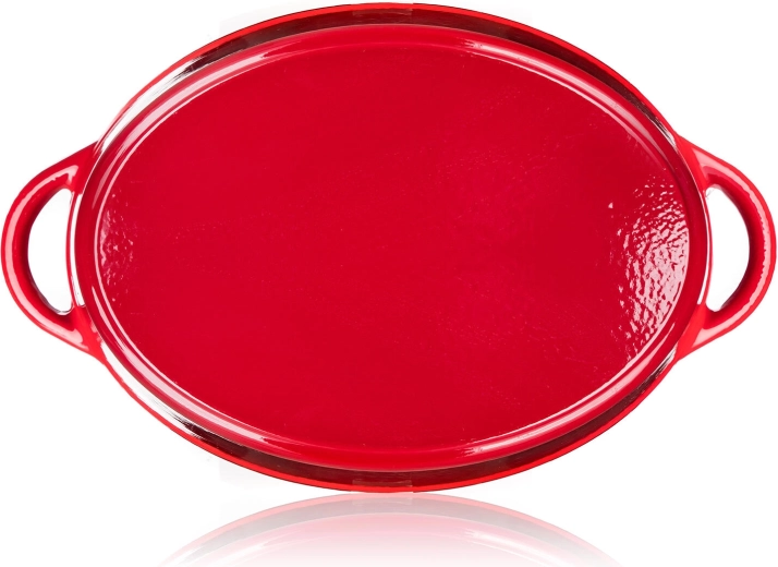 Az elegáns piros színű ovális öntöttvas tepsi fedővel kiemelkedik a magas hőtároló képességgel és egyenletes hőelosztással, így húst, zöldséget és rakott ételeket is gyorsabban és takarékosabban készíthet el. A belső, zománcozott tapadásmentes felület minimalizálja a leégést és megkönnyíti a tisztítást.