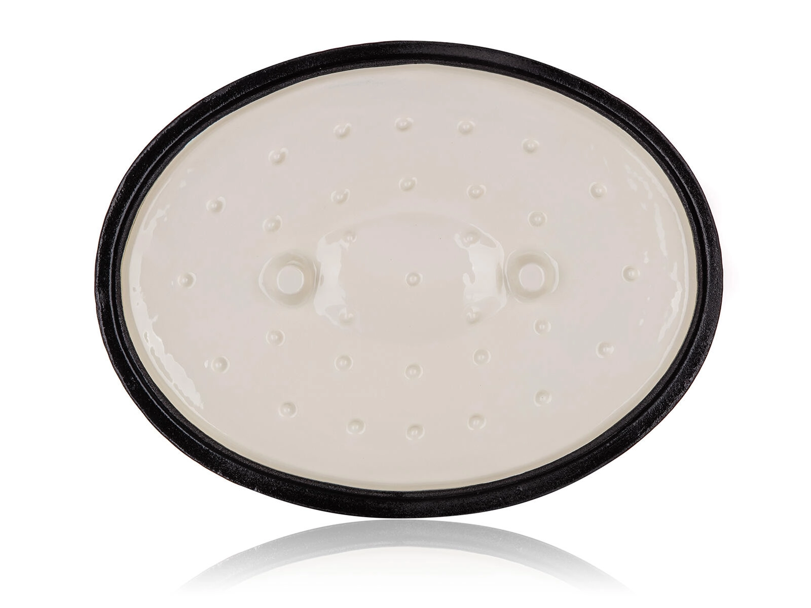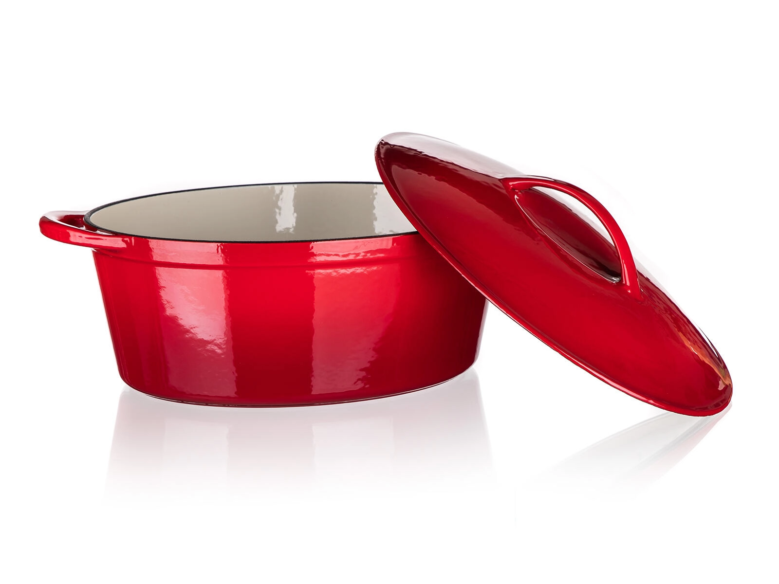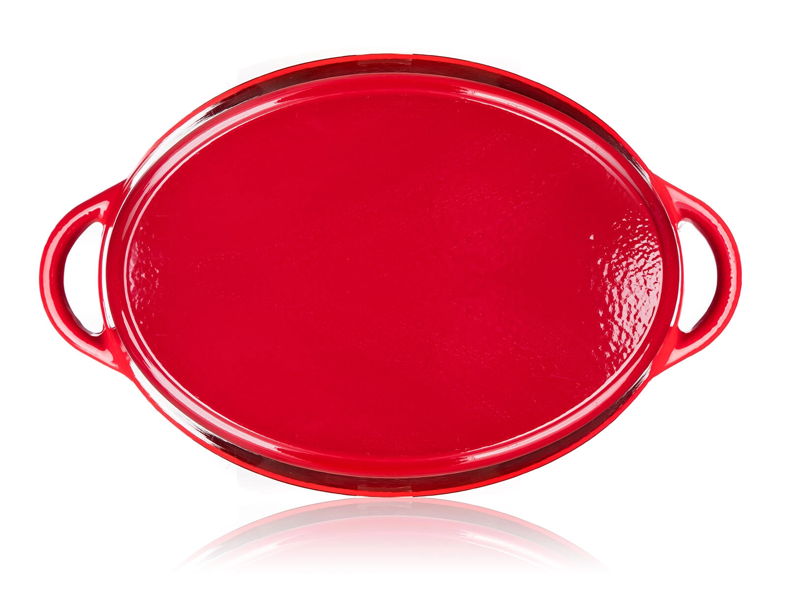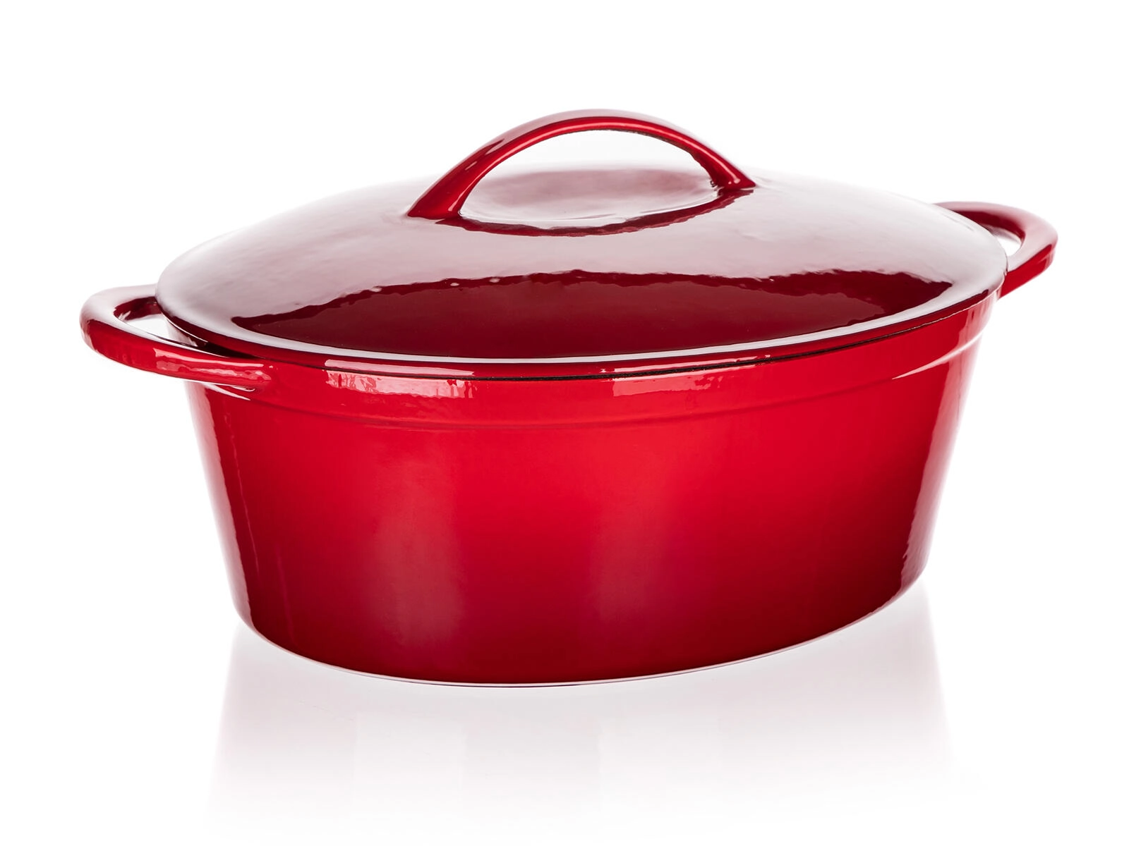 Az elegáns piros színű ovális öntöttvas tepsi fedővel kiemelkedik a magas hőtároló képességgel és egyenletes hőelosztással, így húst, zöldséget és rakott ételeket is gyorsabban és takarékosabban készíthet el. A belső, zománcozott tapadásmentes felület minimalizálja a leégést és megkönnyíti a tisztítást.