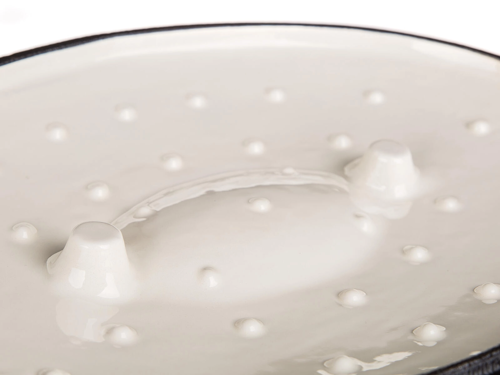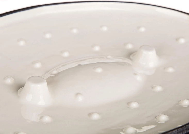A fedő belső oldalán lévő bütykök visszavezetik a lecsapódott gőzt a tepsibe. Az étel szaftos marad és nem ég le.