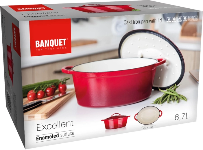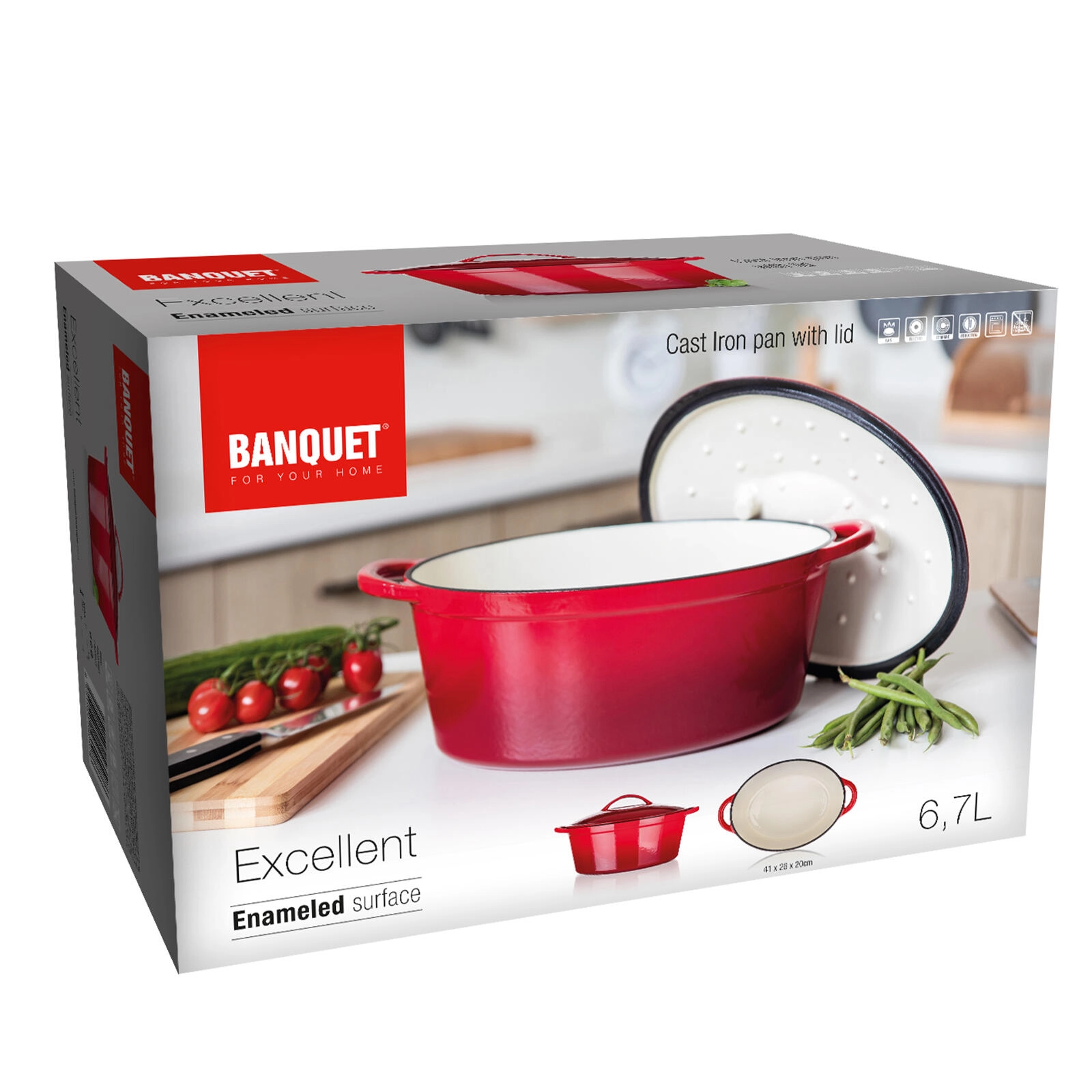 Masszív EXCELLENT öntöttvas tepsi 6,7 l űrtartalommal és zománcozott felülettel, ideális sütéshez, pároláshoz és gratinírozáshoz. Az egyenletes hőelosztás, az önlocsoló fedő és a könnyű karbantartás a tapadásmentes zománcnak köszönhetően szaftos eredményt biztosít otthon és ünnepi asztalon egyaránt.