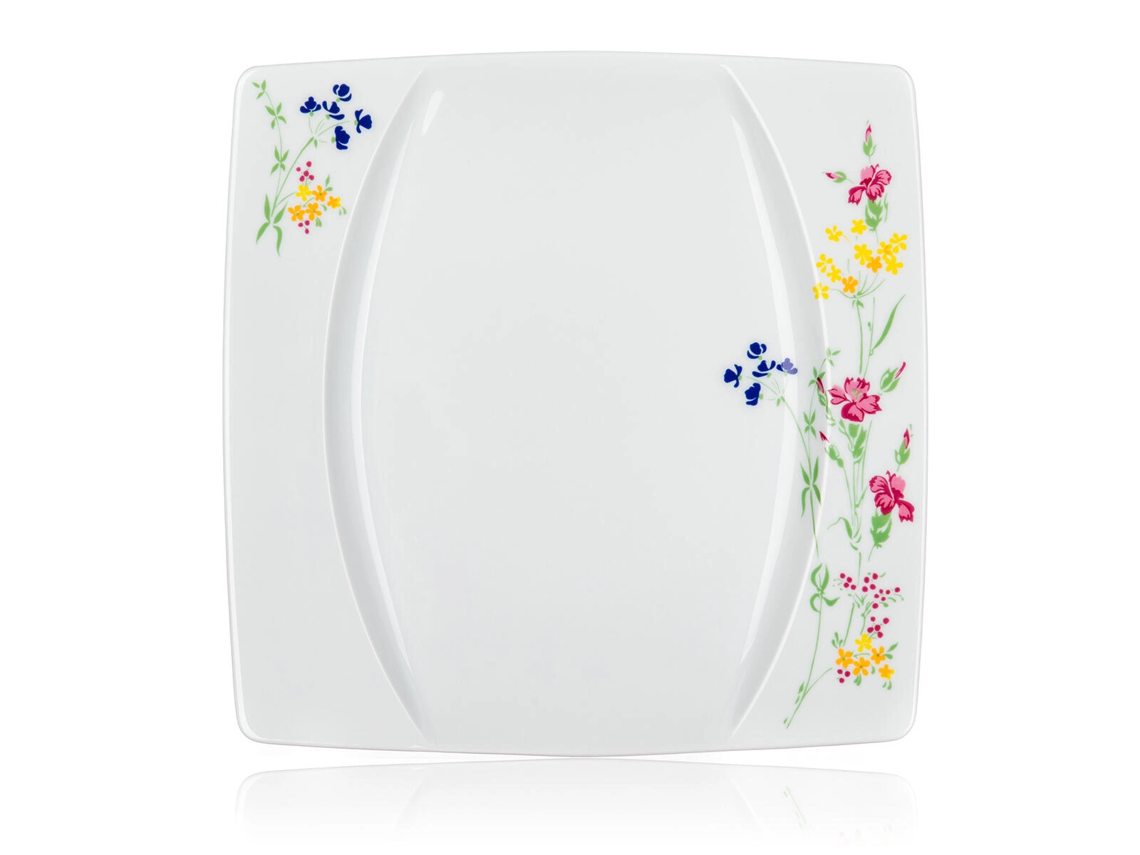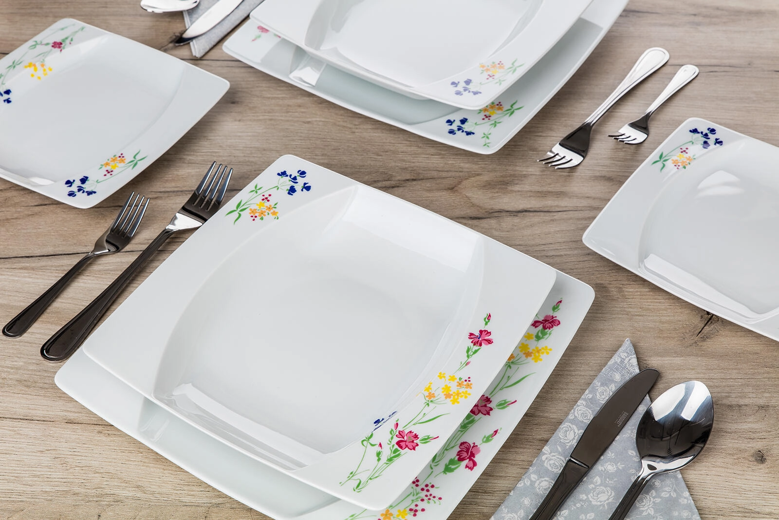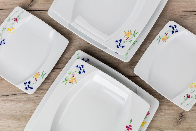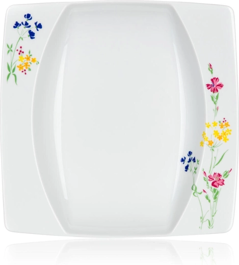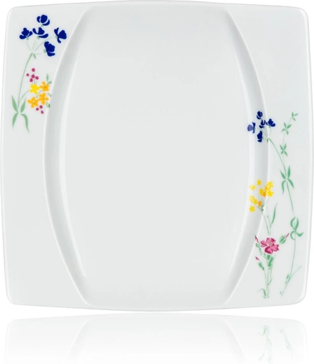 Stílusos, négyzet alakú tányérok finom virágmintával a sarkokban, amelyek egyedi karaktert adnak a terítéknek, és könnyen kombinálhatók más edényekkel.
