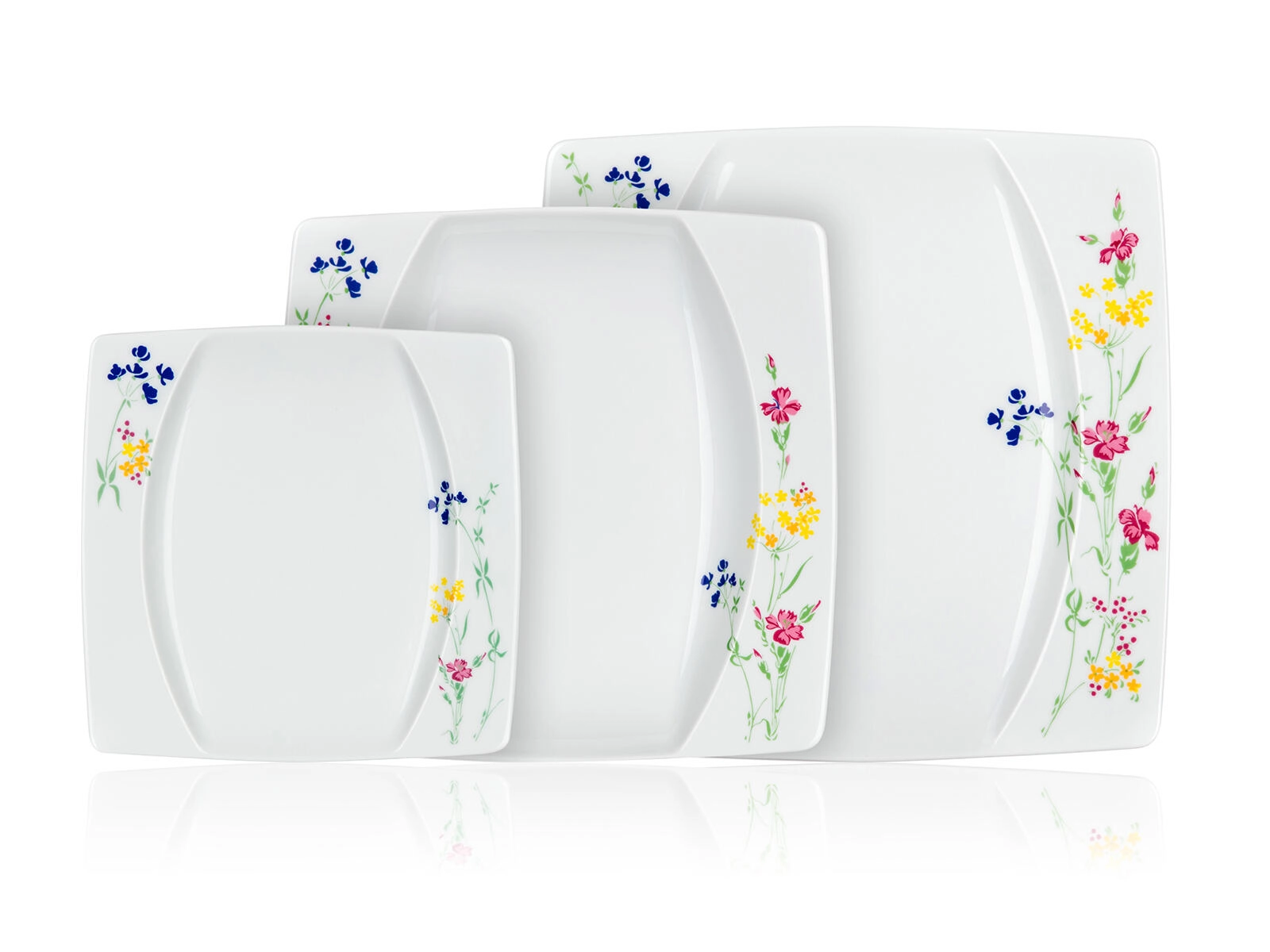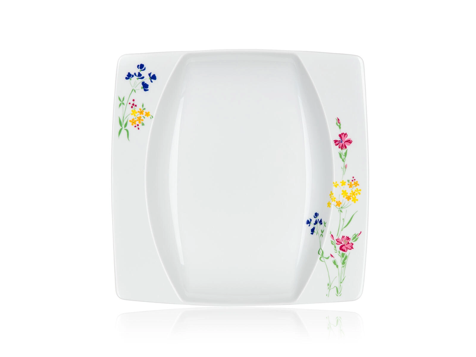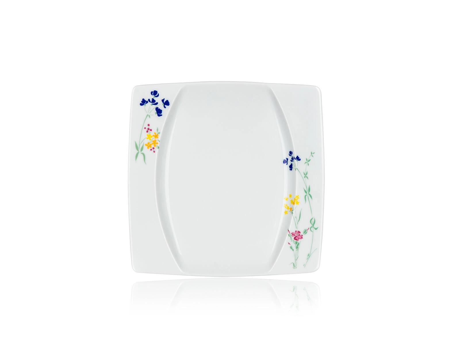 Stílusos, négyzet alakú tányérok finom virágmintával a sarkokban, amelyek egyedi karaktert adnak a terítéknek, és könnyen kombinálhatók más edényekkel.