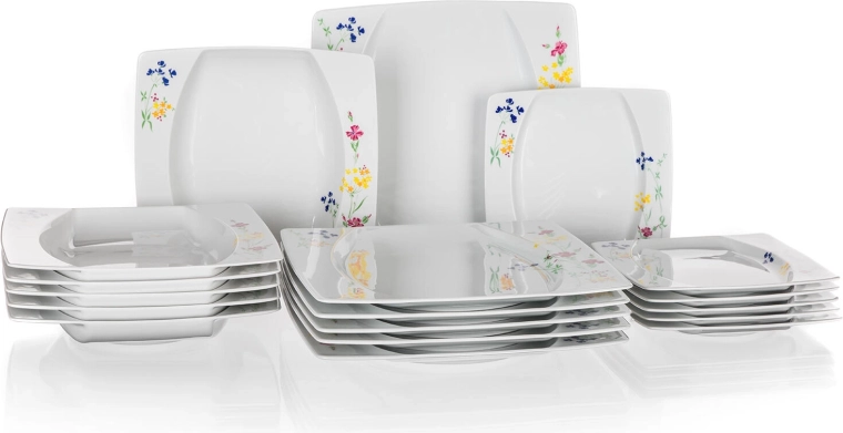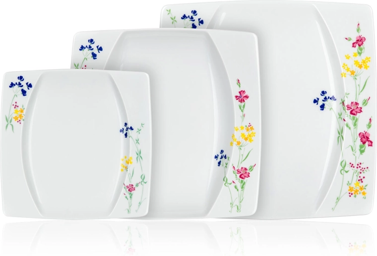 Ez az időtálló, négyzet alakú készlet az elegáns dizájnt a mindennapi, praktikus használattal ötvözi. A széleken elhelyezett finom virágminta és a fényes máz kiemeli az ünnepi és a hétköznapi terítést is. A strapabíró THUN porcelánnak köszönhetően a tányérok könnyen tisztán tarthatók, és hosszú távon megőrzik színüket és fényüket.