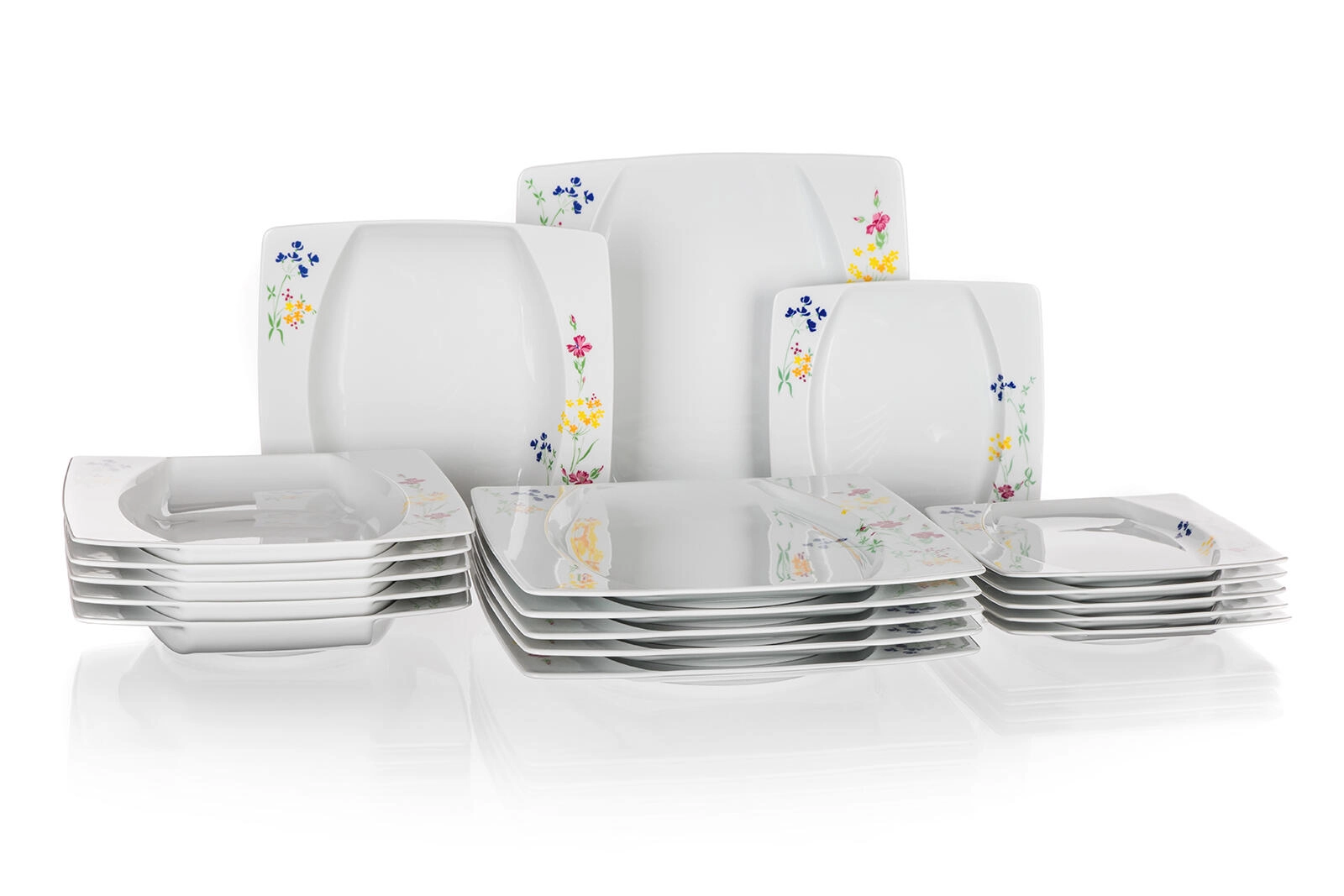 A készlet mindent tartalmaz a teljes tálaláshoz – a levesektől a főfogásokon át a desszertekig. A négyzetes forma enyhén mélyített középrésszel segíti az ételek elegáns tálalását, és megelőzi a szaftok kifolyását.