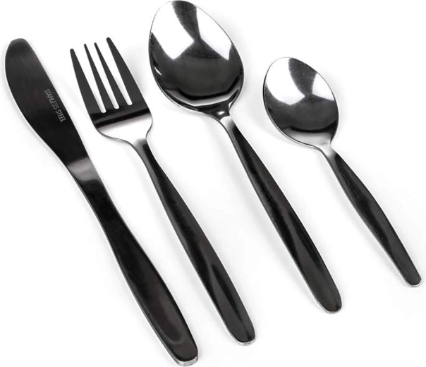 Ez a komplett készlet 6 kést (20,5 cm), 6 villát (19 cm), 6 kanalat (18,5 cm) és 6 teáskanalat (14 cm) tartalmaz. Az evőeszközök tartós rozsdamentes acélból készülnek, felületkezeléssel a mindennapi kényelem és megbízhatóság érdekében – kés hand polish, a többi darab tumble polish a egyenletes fényességért.