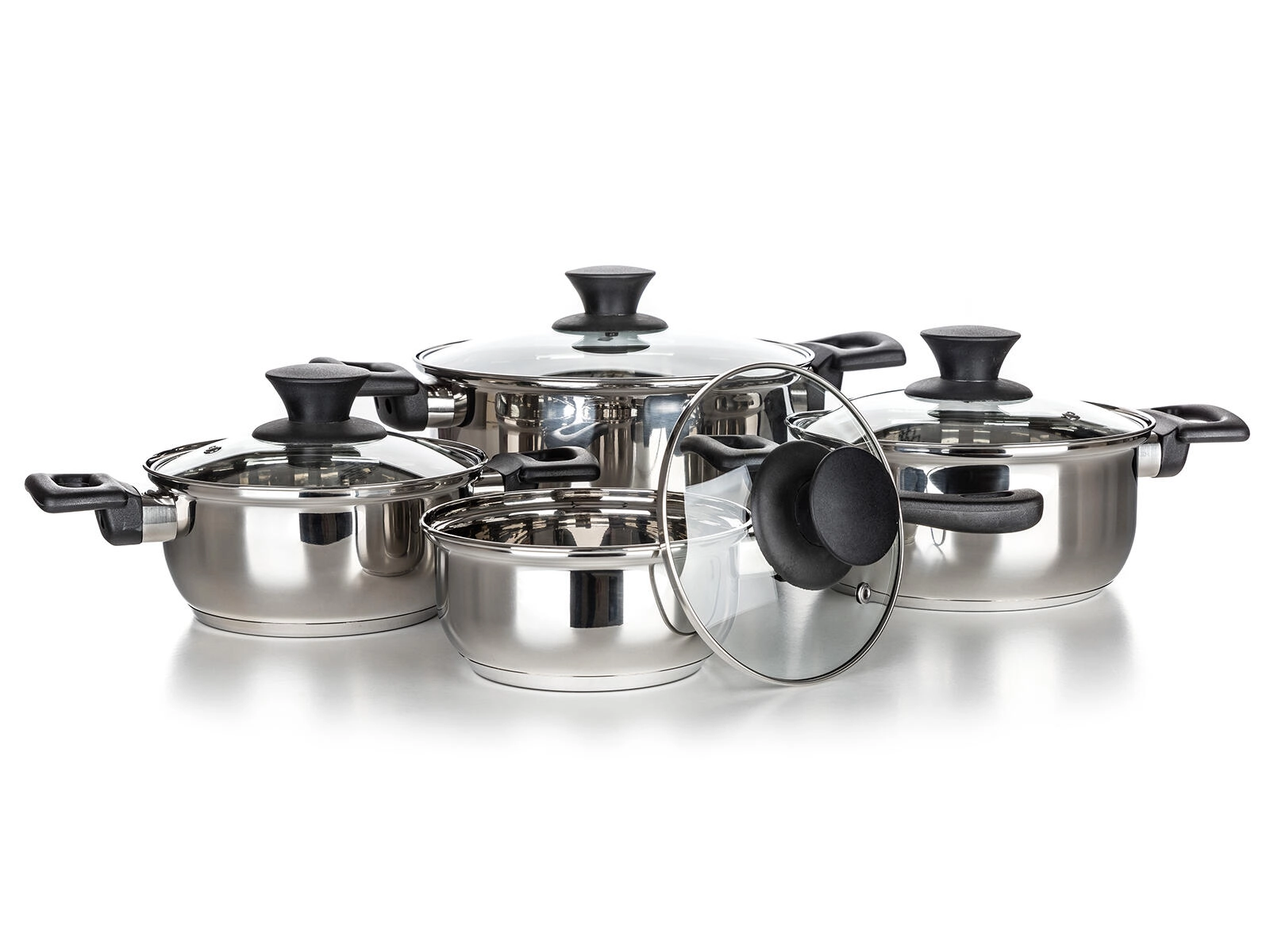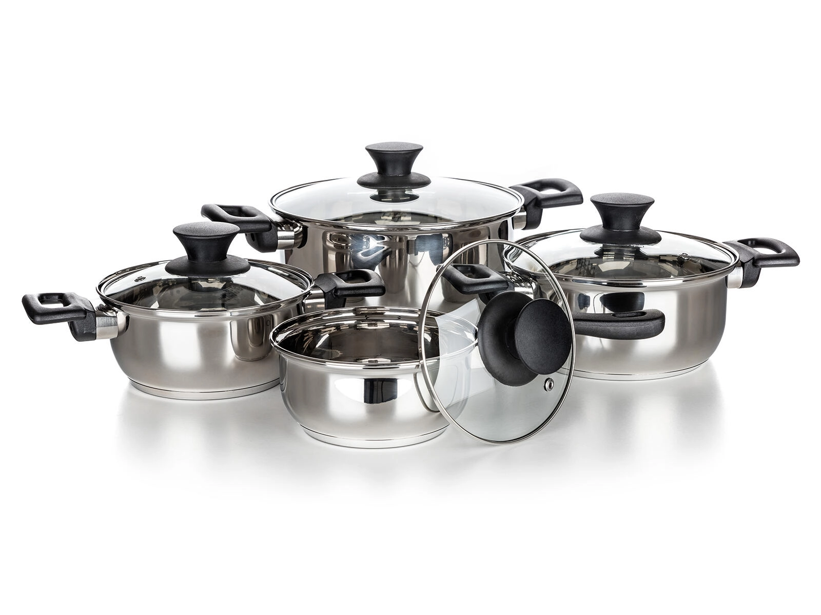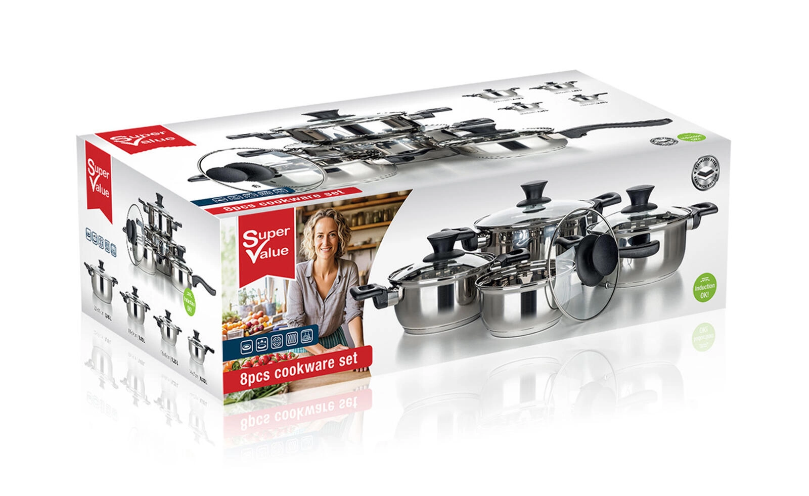 Teljes 8 részes rozsdamentes edénykészlet Super Value a mindennapi főzéshez. Tartós rozsdamentes acél fényes felülettel, edzett üvegfedők gőzkivezető szeleppel és kompatibilitás minden tűzhelytípussal, beleértve az indukciót is. Könnyű karbantartás és mosogatógépben mosható.
