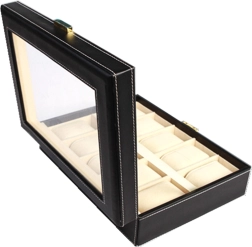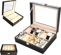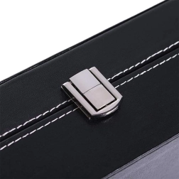 Ez a rendkívül funkcionális ékszerdoboz 10 karóra vagy karkötő számára készült. A praktikus rendező elegáns, fekete színű eco bőrből készült, amelyet ezüst cérnával varrtak meg, hogy még vonzóbb legyen. A fekete szín tökéletesen illeszkedik minden belső térhez.