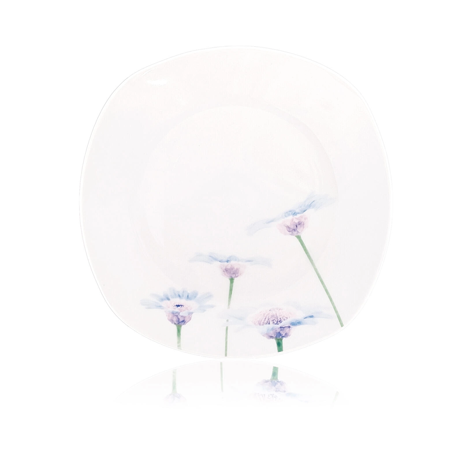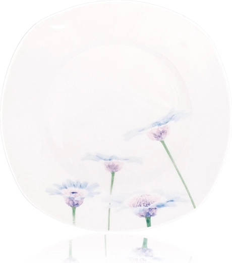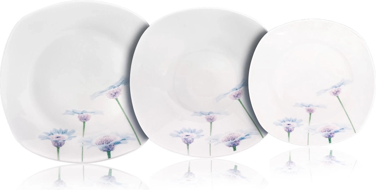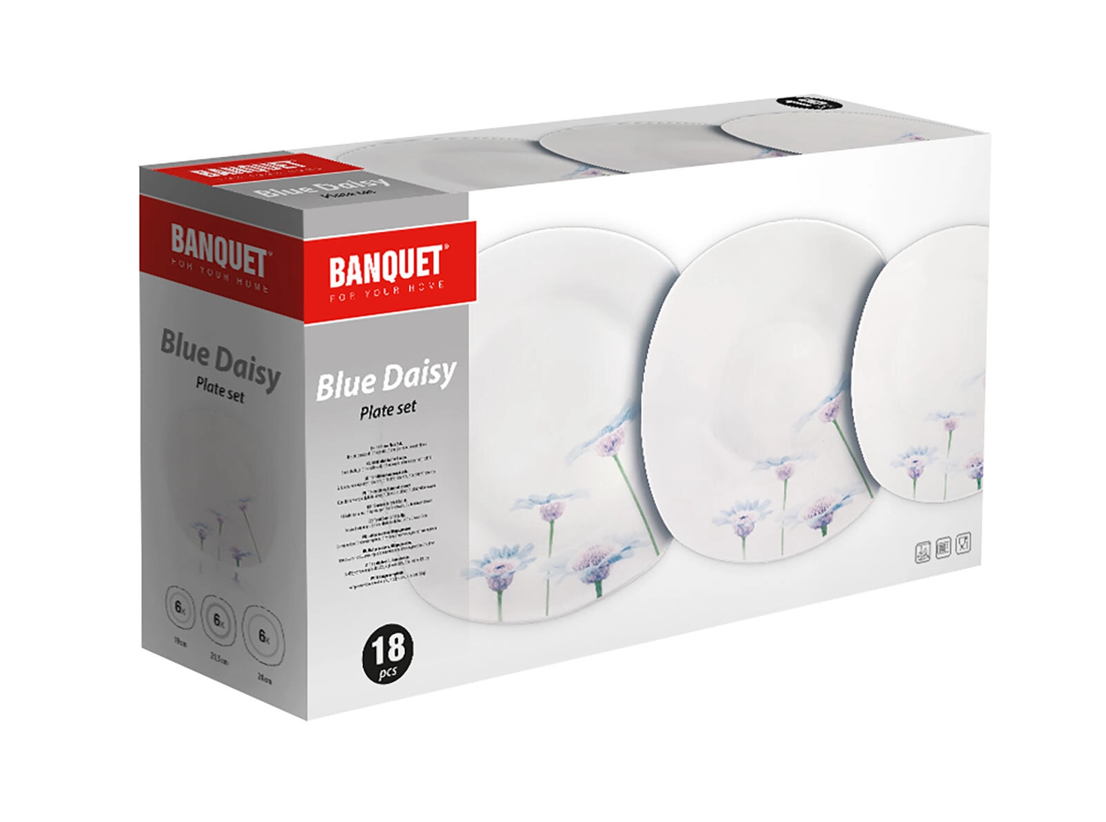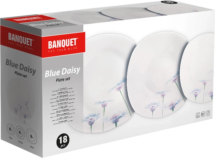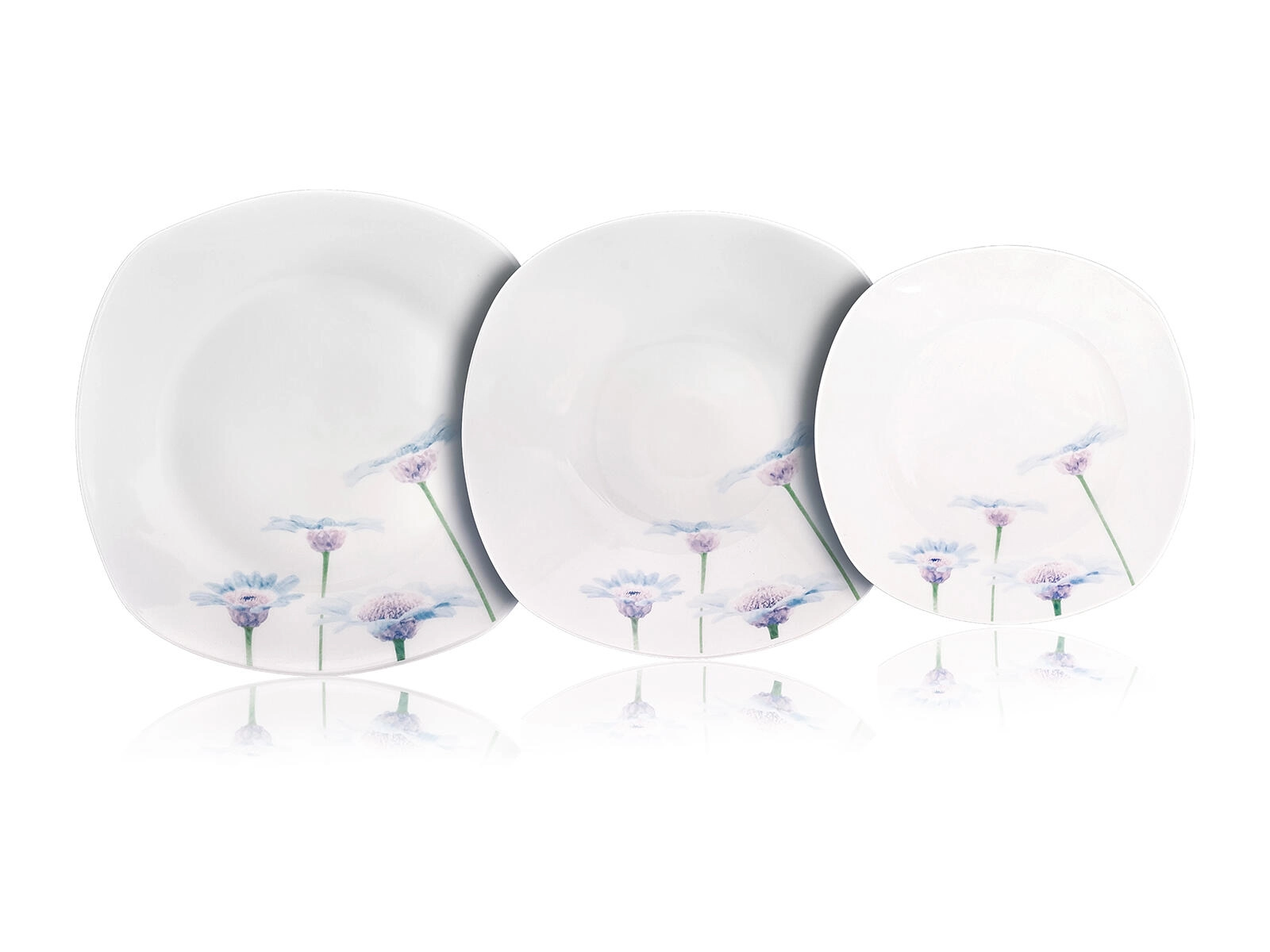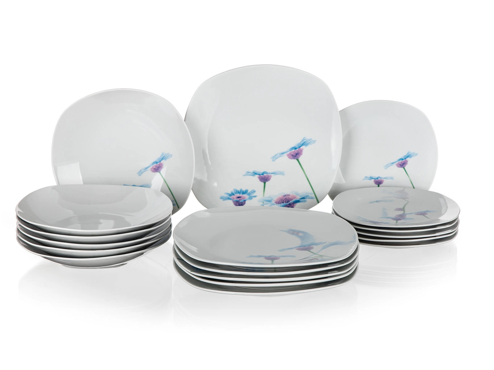 Elegáns, 18 részes porcelán étkészlet a finom Blue Daisy virágmintával, amely feldob minden terítéket. A tányérok univerzális méreteinek és az ellenálló máznak köszönhetően ideális a mindennapi használathoz és ünnepi alkalmakra is. A tányérok modern, lekerekített négyzetes formájúak, mikrohullámú sütőben használhatók, és mosogatógépben moshatók.