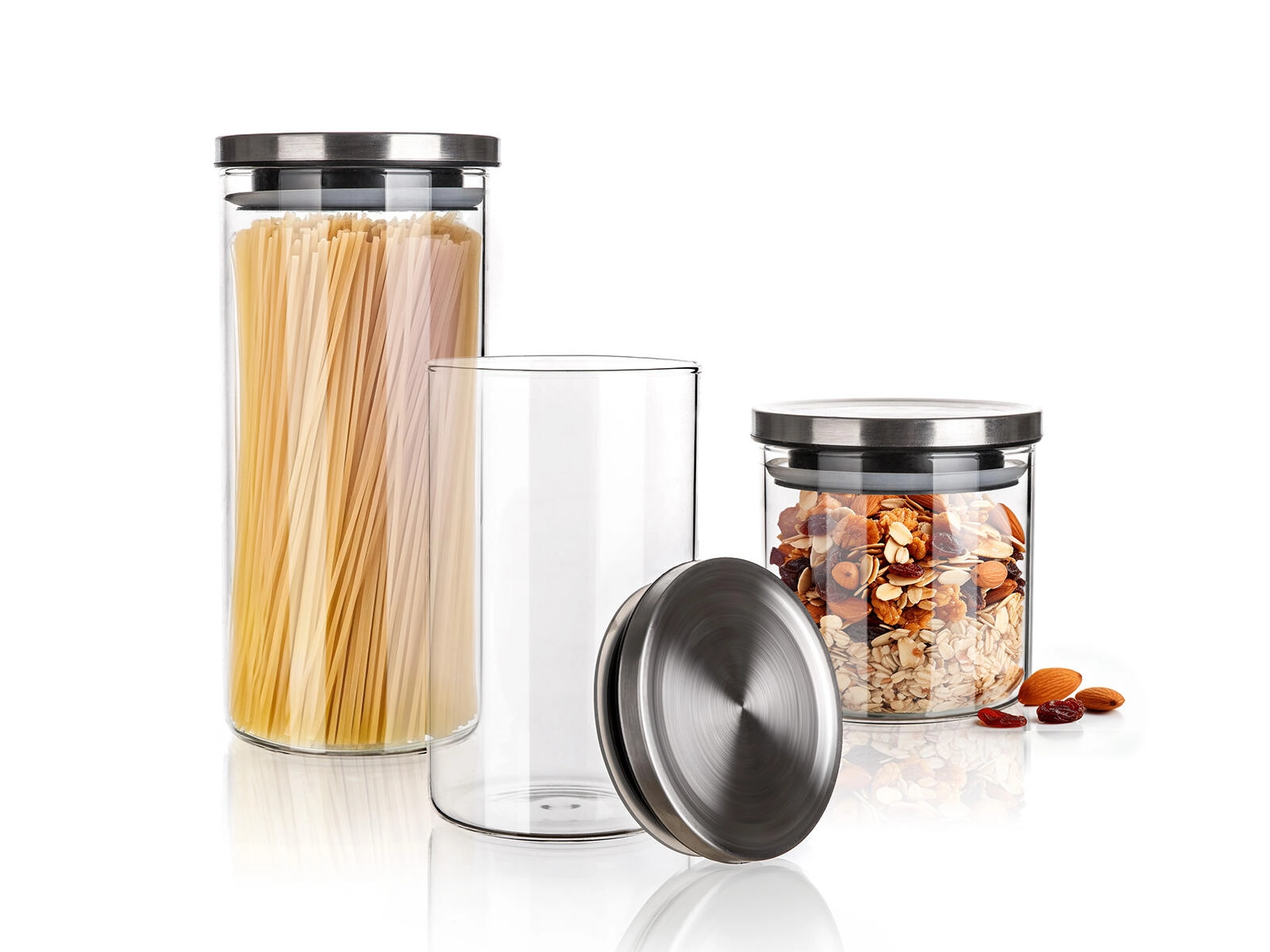 A három praktikus méretnek köszönhetően kényelmesen tárolhatók a spagetti, rizs, gabonapelyhek, hüvelyesek és nasik. A minimalista dizájn kefélt rozsdamentes acéllal remekül illik a modern és a klasszikus konyhákba egyaránt, és megkönnyíti az alapanyagok áttekinthető elrendezését.
