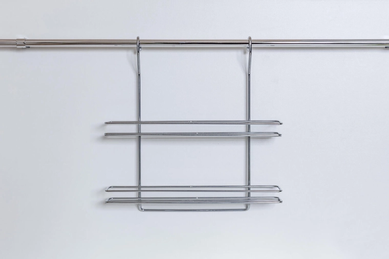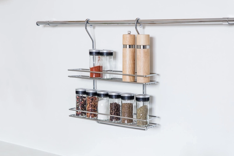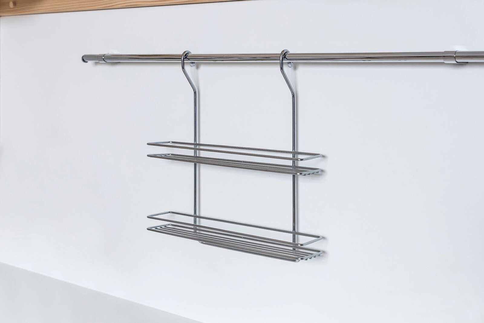 Ez a kétszintes, függesztett polc krómozott acélból ideális megoldás a fűszerek és kisebb konyhai kiegészítők rendezett és stílusos tárolására. A nyitott felépítés jó levegőáramlást és gyors eligazodást biztosít az eltárolt dolgok között.