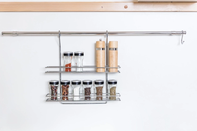A felső és az alsó polc is legfeljebb kb. 5,5 cm átmérőjű tégelyekhez készült, beleértve az AROMI fűszereket. A tartós krómfelület védi a korróziótól és megkönnyíti a karbantartást. A polc könnyedén felakasztható megfelelő függesztősínre vagy rúdra, így azonnal több helyet nyer a munkafelületen.