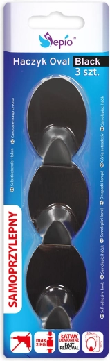 Praktikus, három darab öntapadós, ovális akasztóból álló készlet elegáns fekete színben, tartós acélból. Az erős ragasztórétegnek köszönhetően biztosítja a gyors, fúrás nélküli szerelést és a megbízható tartást sima felületeken. Ideális kulcsokhoz, konyharuhákhoz, törölközőkhöz és kábelekhez a konyhában, fürdőszobában vagy előszobában.