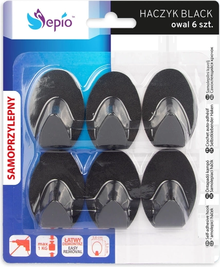 Praktikus és stílusos, ovális alakú, kiváló minőségű acélból készült, elegáns fekete színű öntapadós akasztók. Az erős ragasztószalagnak köszönhetően gyors telepítés fúrás nélkül és megbízható rögzítés érhető el a lakás különböző felületein. A csomag 6 darabot tartalmaz, univerzális felhasználásra konyhában, fürdőszobában, előszobában és irodában.