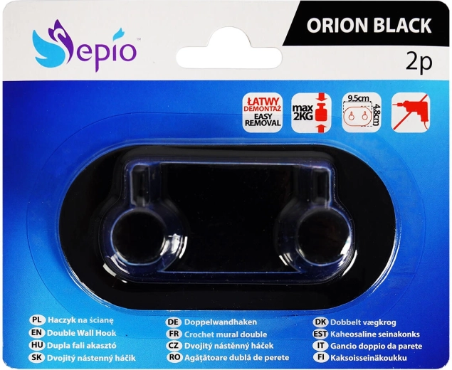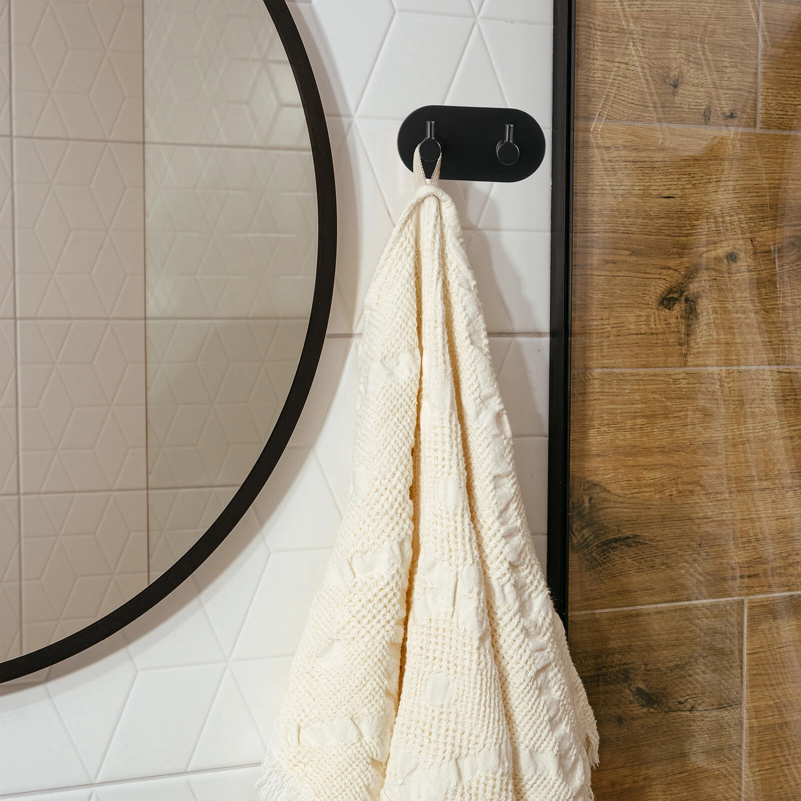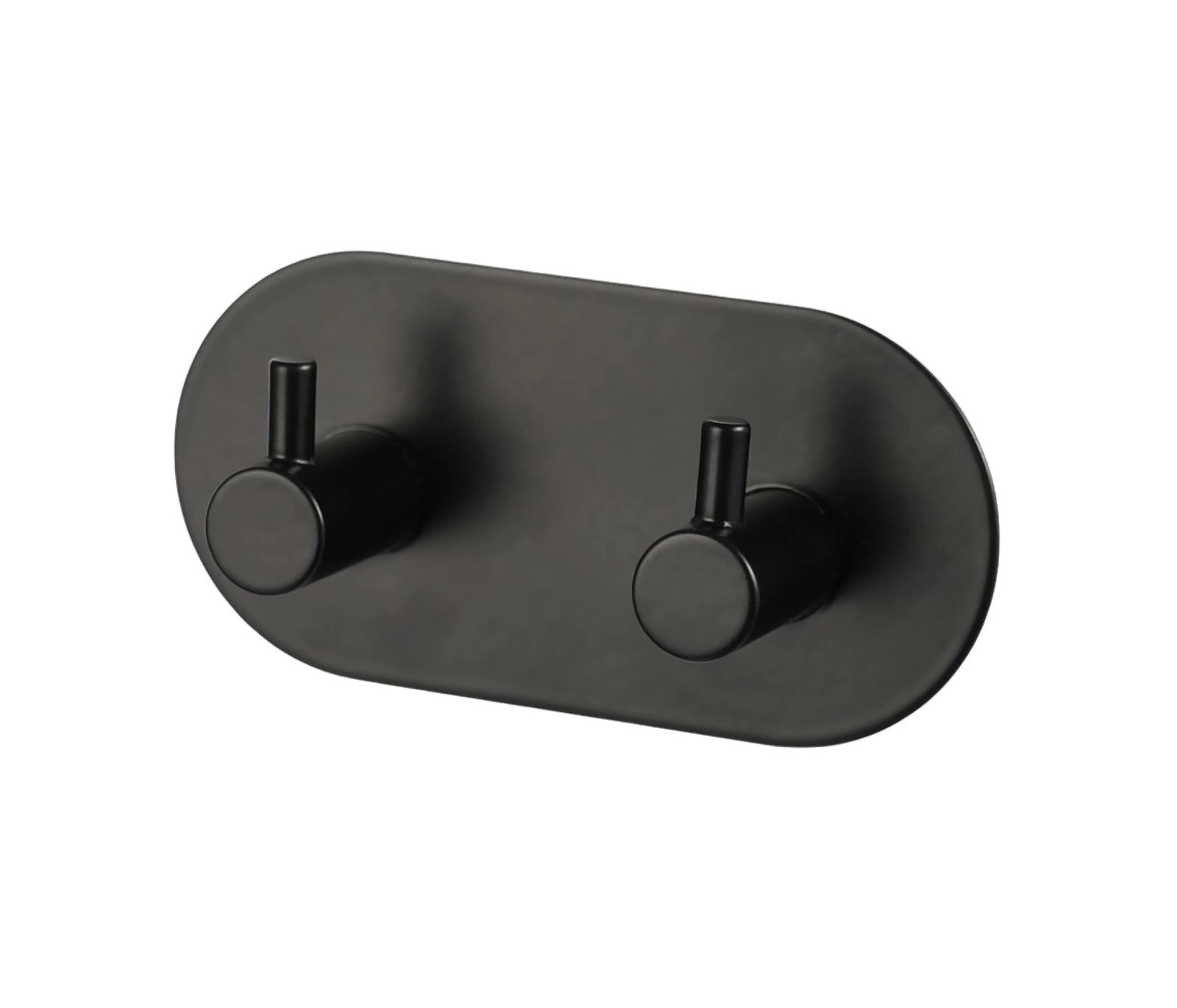 Praktikus és stílusos öntapadós dupla akasztó fémből, matt fekete színben fürdőszobába, előszobába és konyhába. Az erős öntapadó rétegnek köszönhetően egyszerűen rögzíthető fúrás és csempesérülés nélkül. A 9,5 × 8 × 4,5 cm kompakt méret és a két masszív kampó rendet teremt törölközőknek, köntösöknek vagy kulcsoknak.