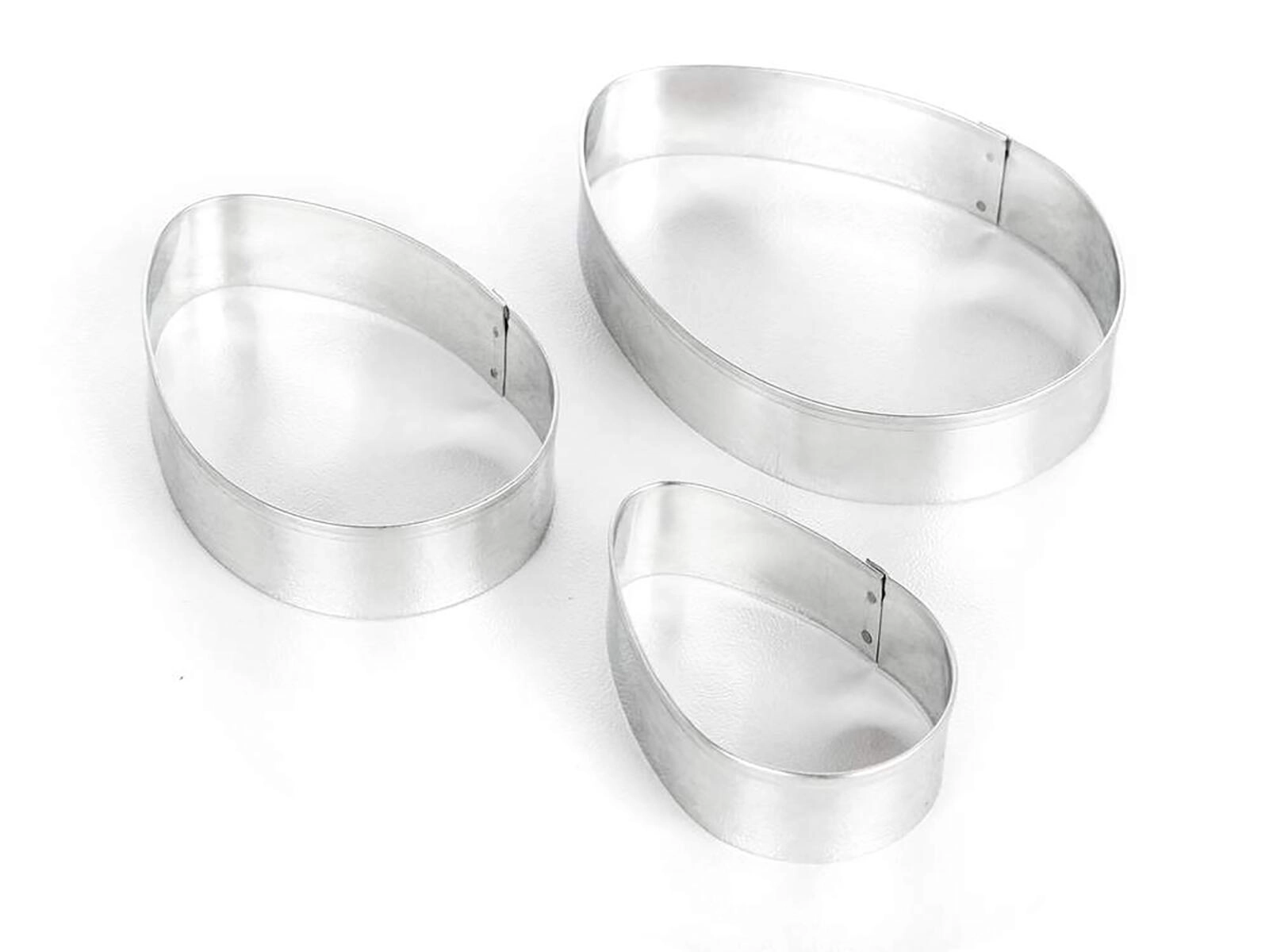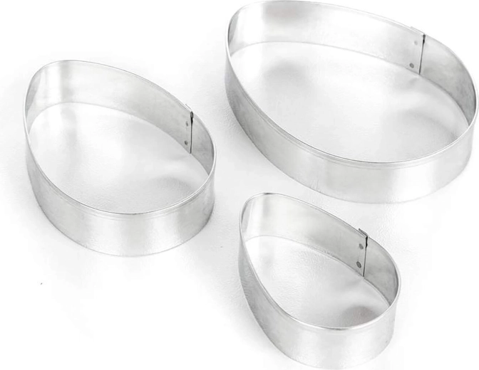 A készlet kicsi (5,5 × 3,5 cm), közepes (7 × 5 cm) és nagy (8,4 × 6,5 cm) tojásformát tartalmaz – ideális rétegezéshez, díszítéshez és különféle tésztákhoz.