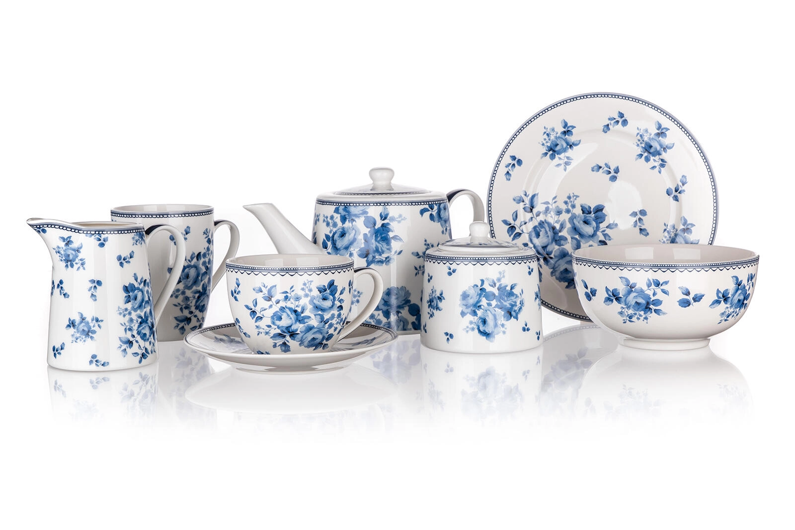 Alkossa meg az egységes Blue Flower szervizkészletet – kanna, csészék, cukortartó és további darabok azonos dekorral.