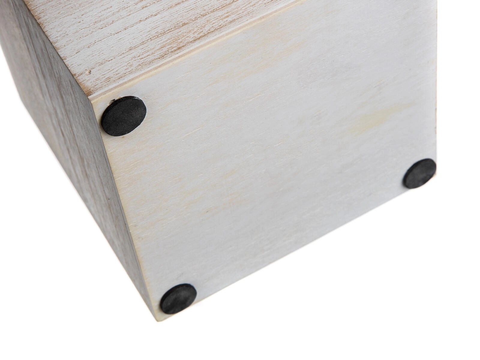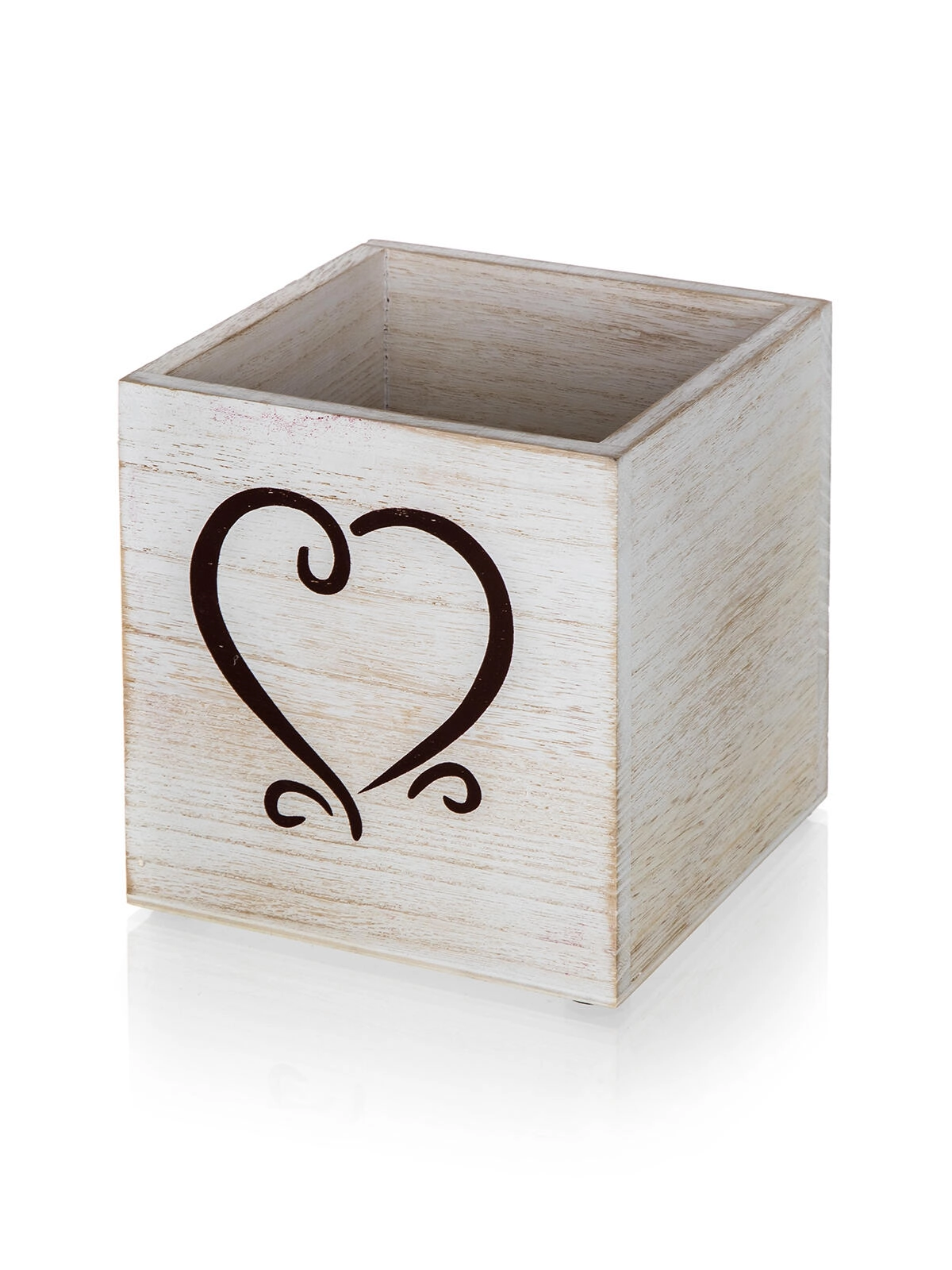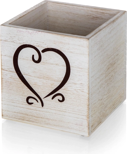 Stílusos fa doboz fehér patinával és szív motívummal, amely rusztikus bájt kölcsönöz otthonának. Kiválóan szolgál dekorációként, ceruzatartóként vagy mini kaspóként szárított virágokhoz. A stabil védőlábaknak köszönhetően óvja a felületeket, masszív kialakítása pedig hosszú élettartamot biztosít.