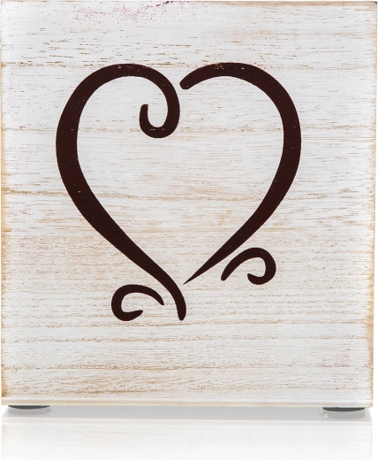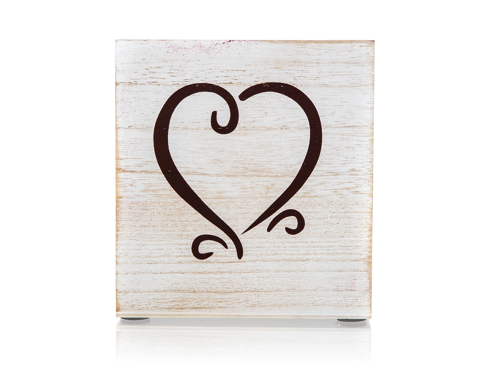 A fehér patina és a visszafogott szív motívum otthonos, barátságos karaktert ad minden polcnak vagy íróasztalnak.