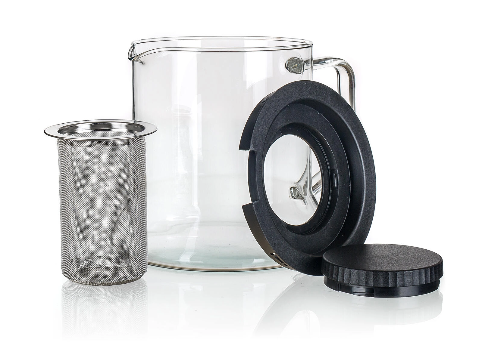 A finom rozsdamentes acél szűrő a legapróbb leveleket és gyógynövényeket is felfogja, és könnyen kivehető, ha szűrő nélkül szeretné használni a kancsót. A sima, nem porózus felület higiénikus és könnyen karbantartható – a kancsó és az alkatrészek mosogatógépben moshatók. A műanyag fedél jól zár, a kényelmes üvegfül pedig biztonságos kiöntést biztosít.
