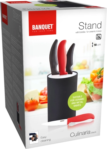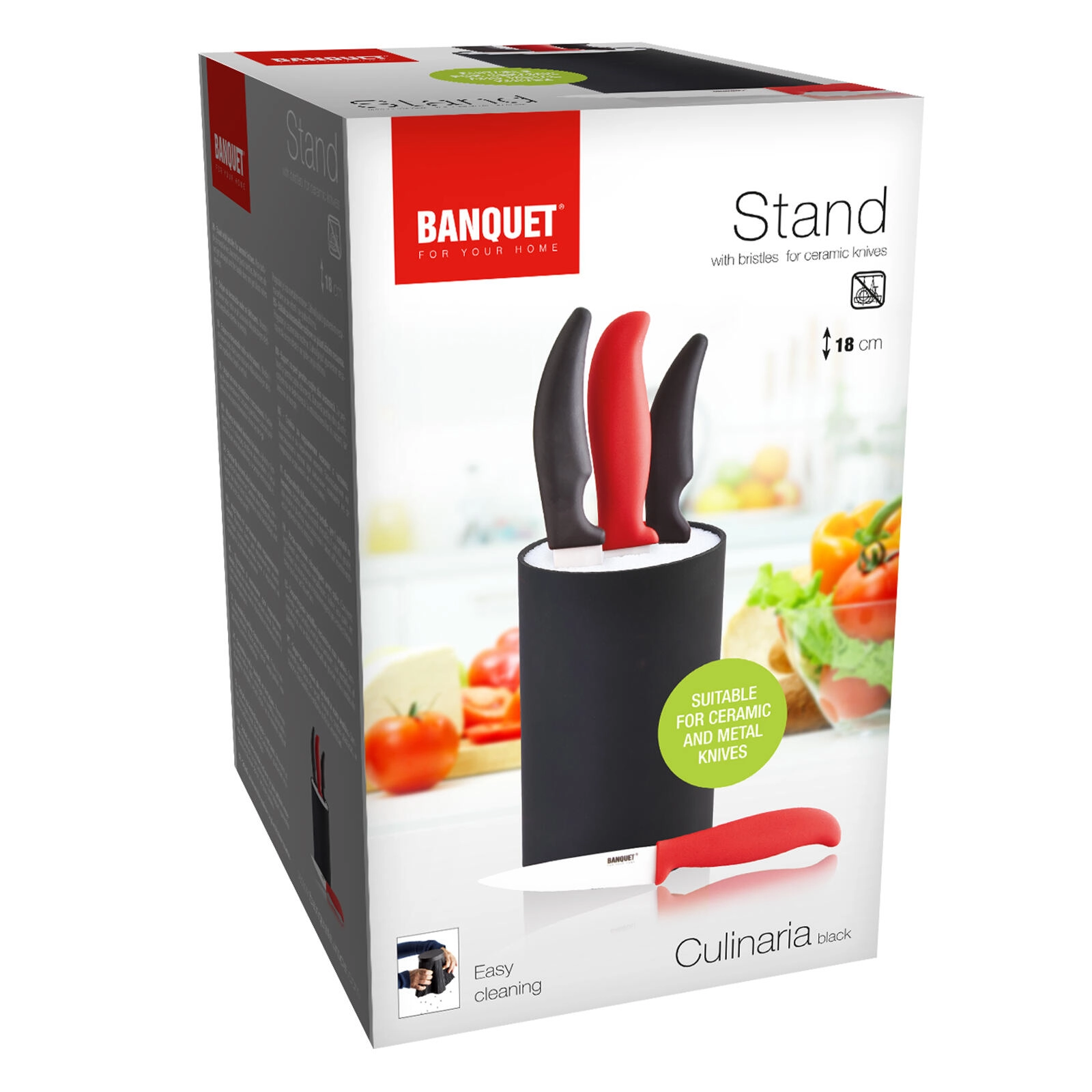Az elegáns CULINARIA Black késblokk a konyhai és kerámia késeket mindig kéznél és biztonságosan tárolja. Kompakt méretekkel, 11 cm átmérővel és 18 cm magassággal rendelkezik, valamint kivehető sörtés műanyag betéttel a pengék kíméletes behelyezéséhez. Tartós kivitel polipropilénből, univerzális fekete színben, amely bármely konyhába illik.