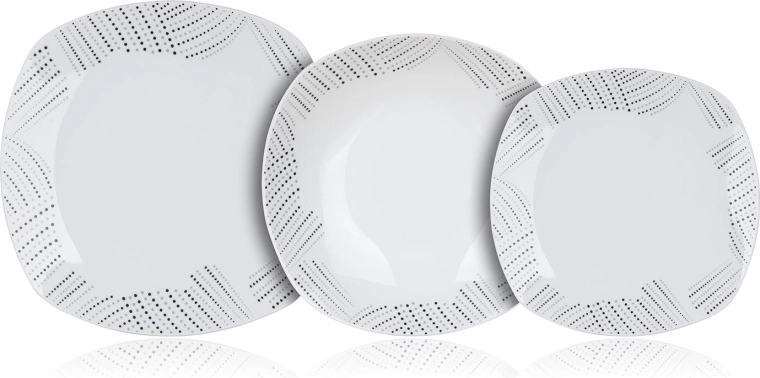 A készlet mindent tartalmaz a teljes terítékhez: desszertes tányérok előételekhez és desszertekhez, mély tányérok levesekhez vagy tésztákhoz, valamint lapos tányérok főételekhez. A mikrohullámú sütőben és mosogatógépben való használhatóság a mindennapi használatot maximálisan kényelmessé teszi.