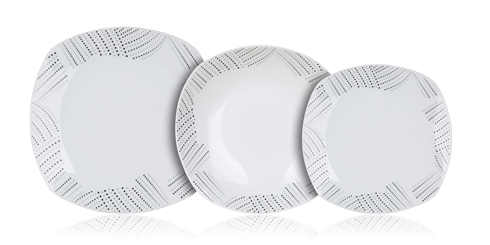 Elegáns BANQUET Charme Square porcelán étkészlet 6 személy részére, modern lekerekített sarkú, négyzetes formával és visszafogott pöttyös szegélymintával. Mosogatógépben és mikrohullámú sütőben is használható, ideális a mindennapi étkezésekhez és ünnepi alkalmakra.