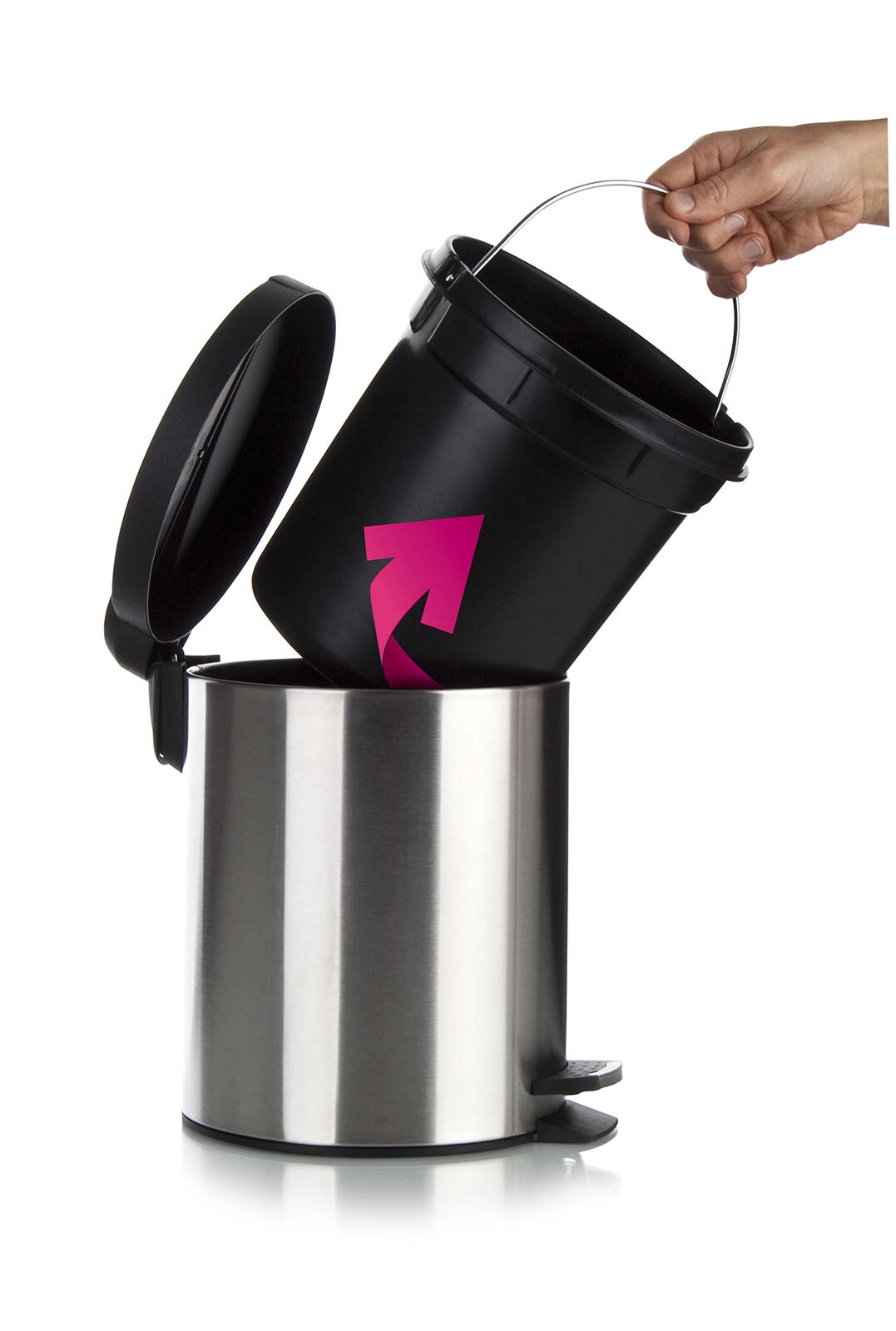 A fém füllel ellátott műanyag edény egyszerűen kivehető, a hulladék rendetlenség nélkül kiönthető, a szemetes pedig gyorsan tisztítható.