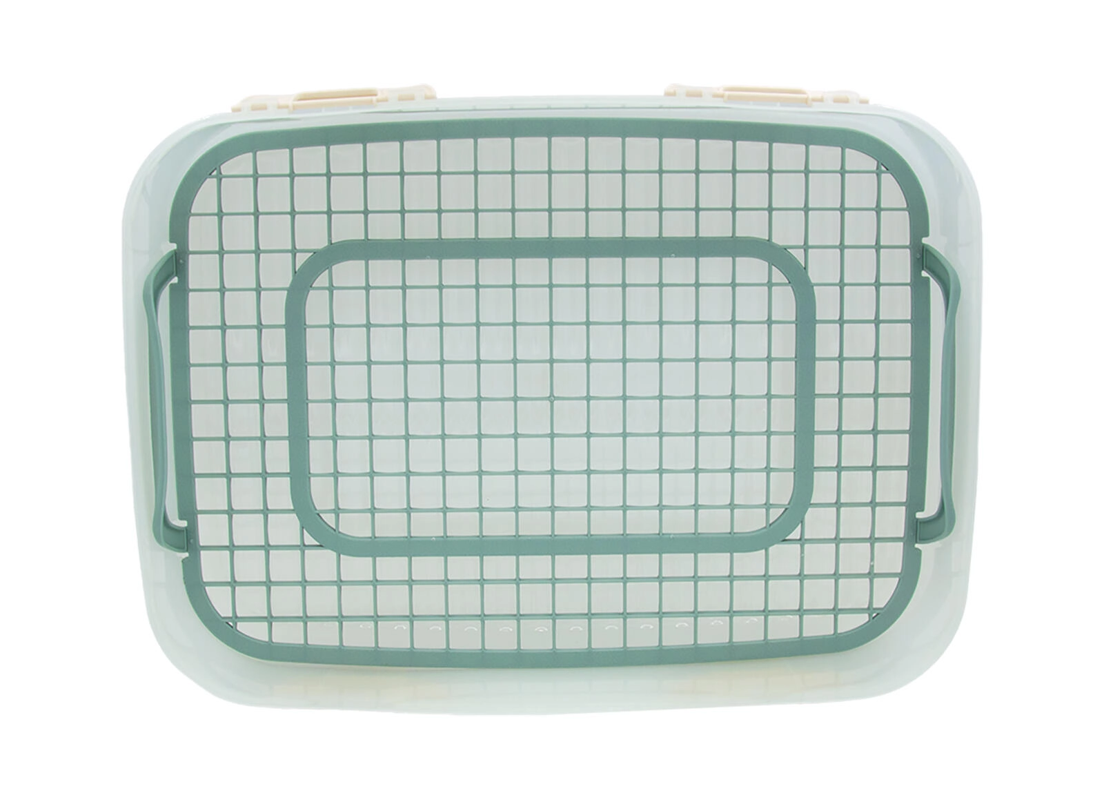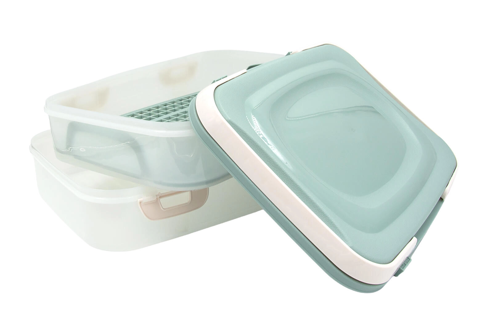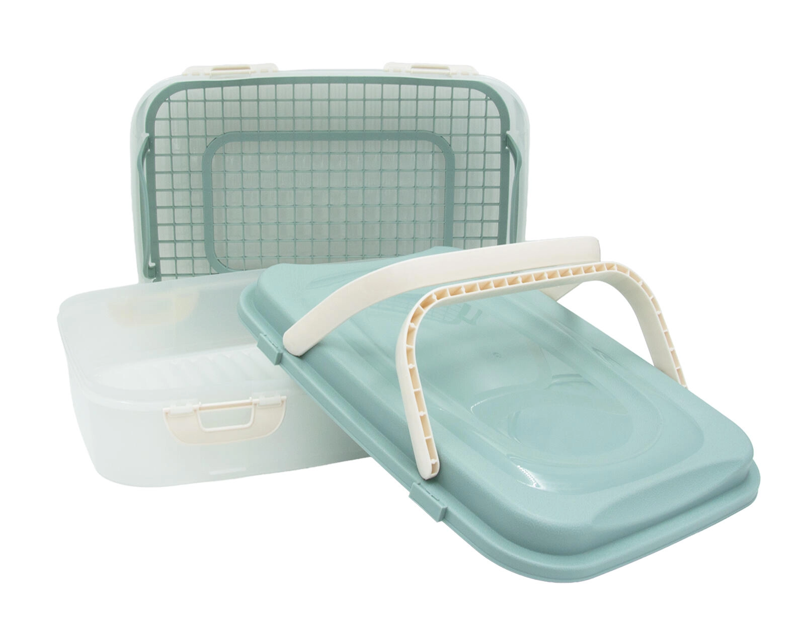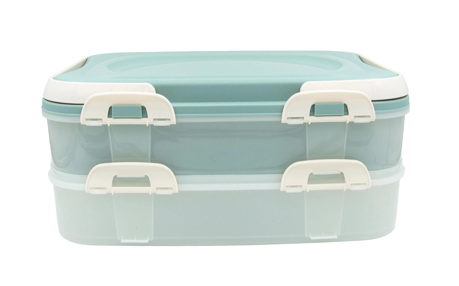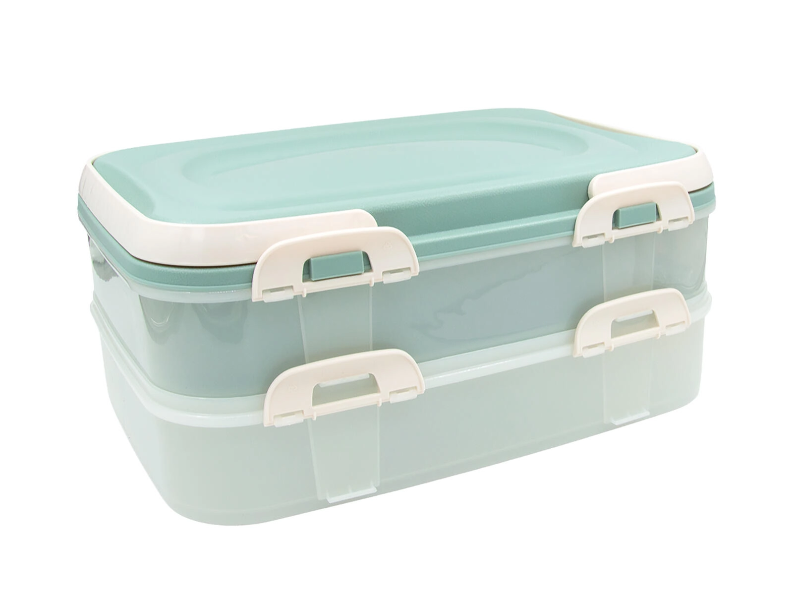 A kétszintes party box elegáns mentazöld színben megbízható segítség ételek szállításához és rendezett tárolásához. Az átlátszó oldalak megkönnyítik a tartalom ellenőrzését, a masszív záróklipszek biztos zárást adnak, a lehajtható fogantyús fedél pedig kényelmes hordozást nyújt.