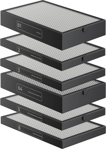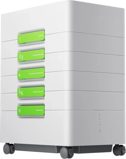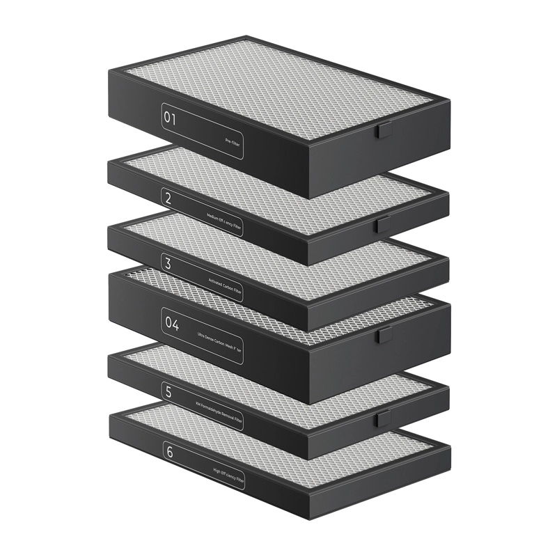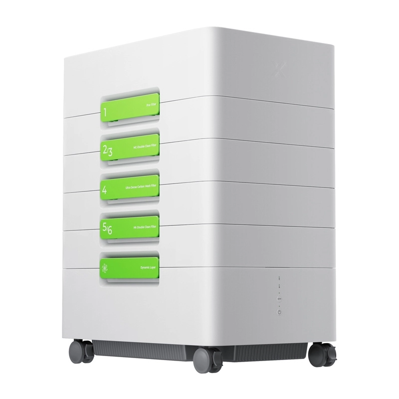 A komplex rendszer felfogja a port, a mikrorészecskéket és a káros gázokat: előszűrő, közepes hatékonyságú szűrő, dupla aktívszén-réteg, formaldehid-szűrő és HEPA 99,97% 0,3 μm-nél.