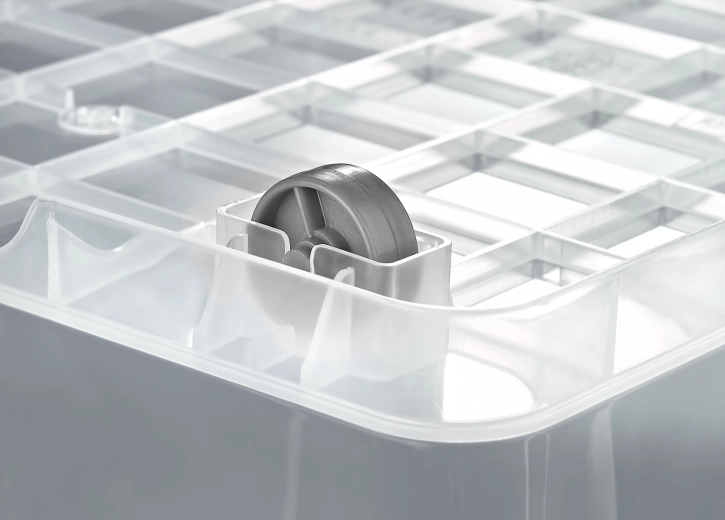 Az integrált kerekek a teljes terhelés mellett is egyszerű mozgatást tesznek lehetővé, így a dobozt könnyedén áthelyezheti oda, ahol éppen szükség van rá. A két erős klippel ellátott fedél megbízható zárást biztosít, és véd a portól és a nedvességtől.