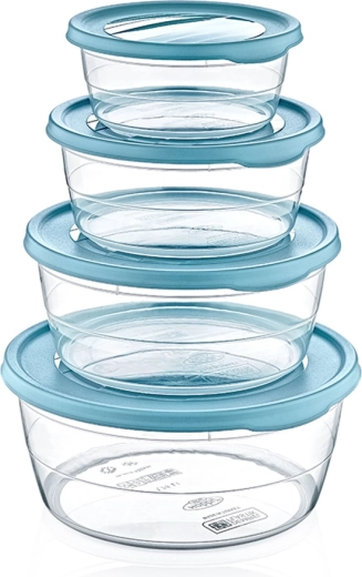 Átlátszó tárolók az egyszerű tartalomellenőrzéshez és egymásra rakható, kerek forma, amely helyet takarít meg a hűtőben és a szekrényben is.