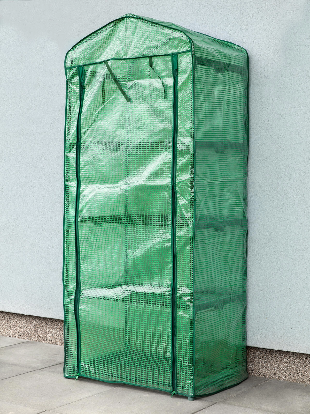 Kompakt kerti fóliasátor 69 × 50 × 160 cm méretben, négy stabil polccal, cipzáras bejárattal és strapabíró hálós fóliával a növények védelméért. Ideális palántaneveléshez, a zöldségek növekedésének gyorsításához és helytakarékos megoldásként erkélyre, teraszra és kertbe.